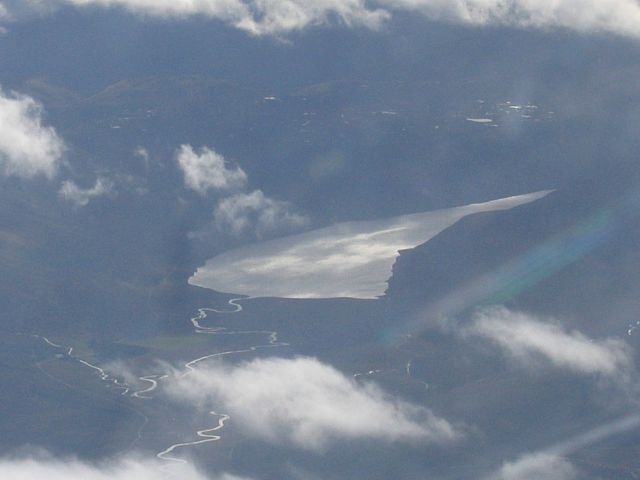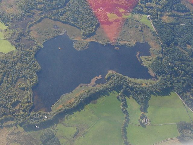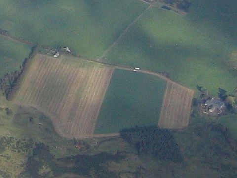 | View south west from Ballater to Loch Muick through a gap in the clouds. | On my way down near Aboyne I took more pictures of Lochs Davan (and Glendavan House) and Kinord (and the river Dee) from the East. | View north to Tarland. Note the field to the bottom right. See the 2 white oblongs on the track? That's the Lasham K21 and it's trailer (wings already put away) after a landout. | ||