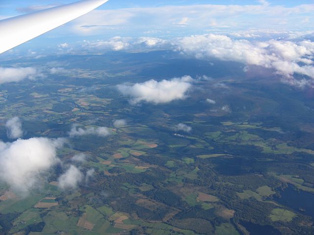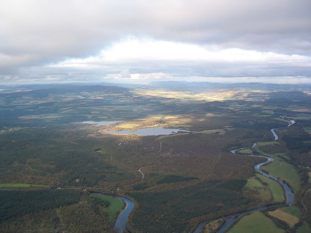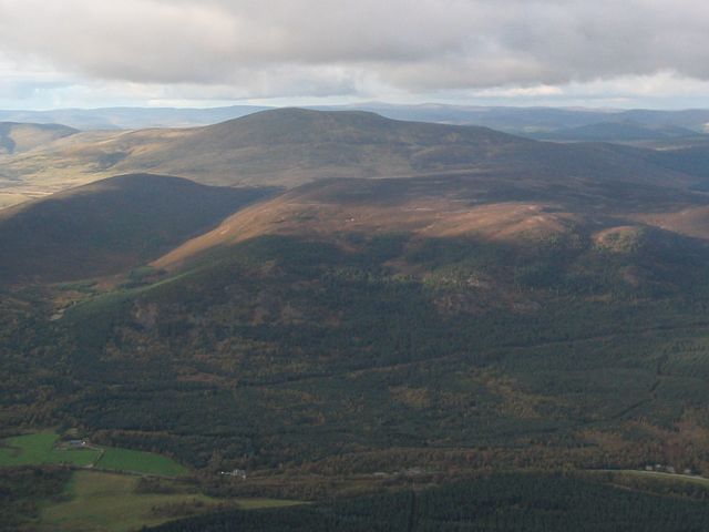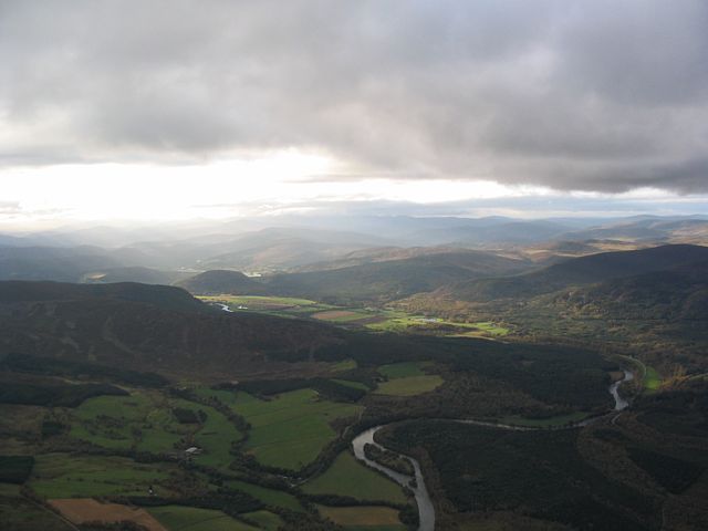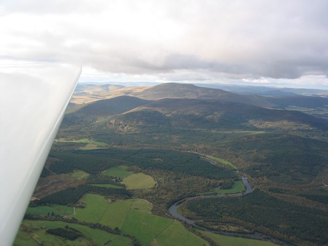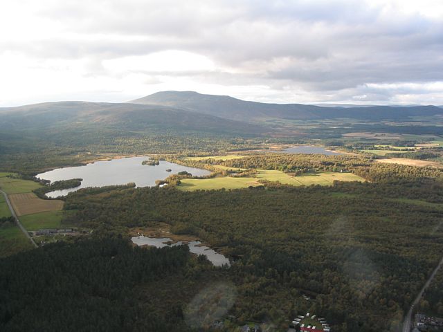 | Another view of the Lochs from the south-southwest, with the river Dee snaking past in the foreground. | Two shots of Morven from the south, one with the river Dee in the foreground. | A view westwards up the Dee Valley from the local ridge to the northeast of Aboyne airfield. | |