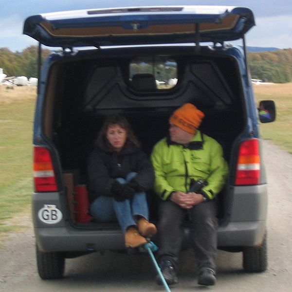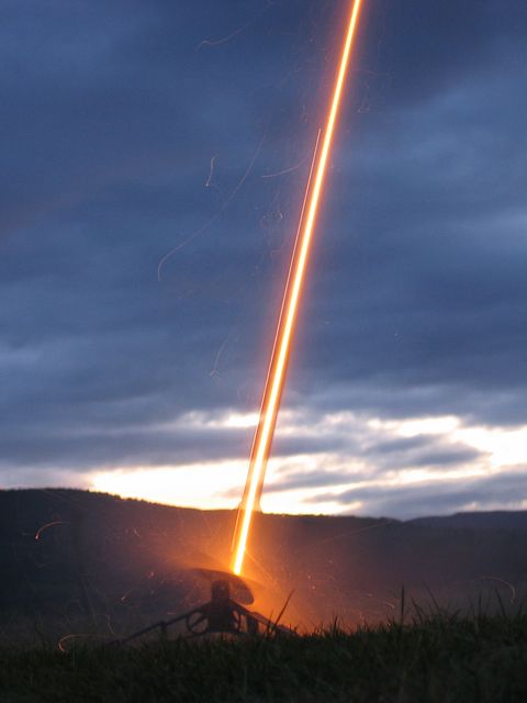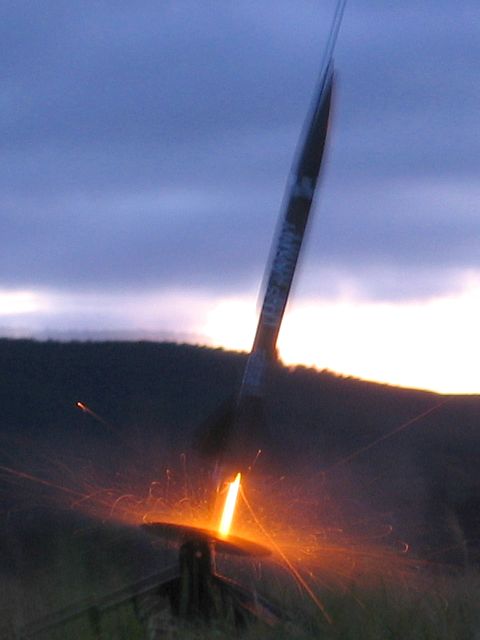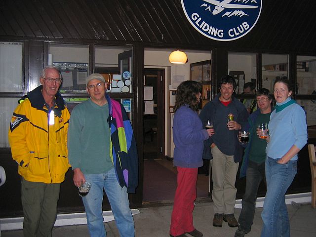 | View northwest to Morven (shrouded in cloud) as a shower passes through. Morven is a good local wave source at 2,800 feet QNH. | On the last night (Friday) we set some rockets off. Here Gordon and Nicki are preparing them. | Waiting for the rockets. From left to right: Gerry English; Mike Birch; Al Nunn and Andrea; Paul Barnet and Alison Booker | Rocket 1 before launch, a blurry rocket 2 during launch, and a slow exposure of rocket 3 during launch. | ||
