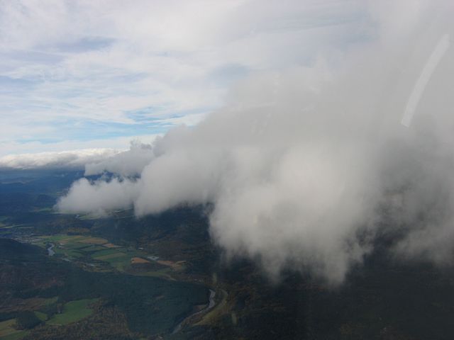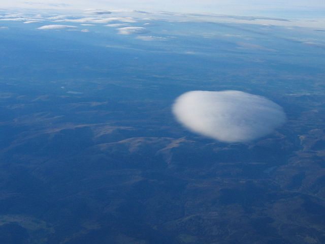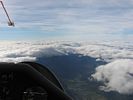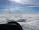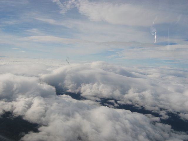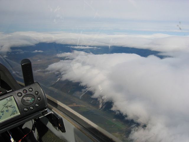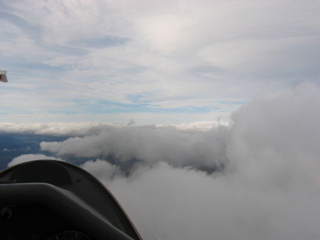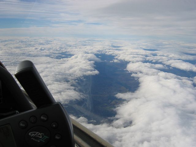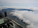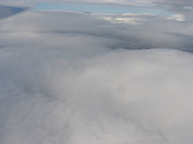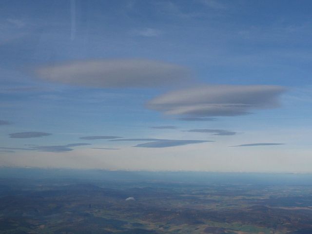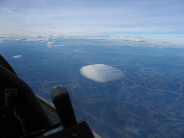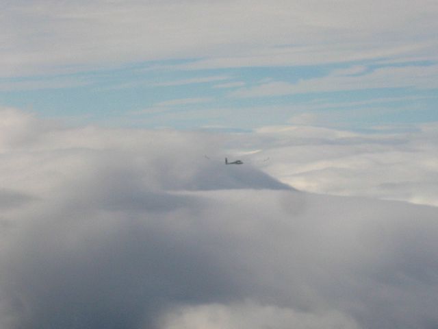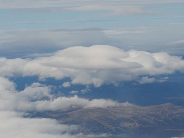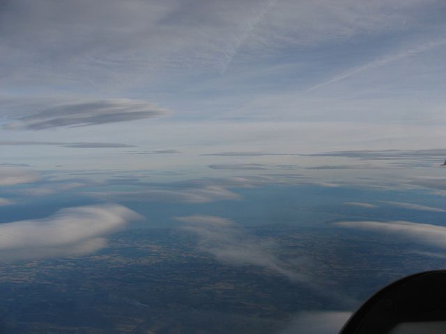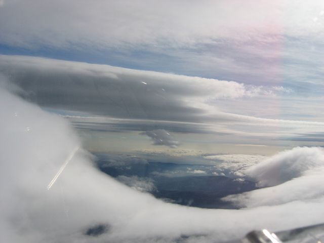| This shot shows the wave well, lining up the cumulus below. | Clouds thickening up a bit. | Upper lenticulars appearing. | Looking back along my wave bar. | A lenticular to the north, and Morven below it. | I spotted 776 below me as we surfed above cloud. Al Nunn in the back. Not sure who was in the front. | |