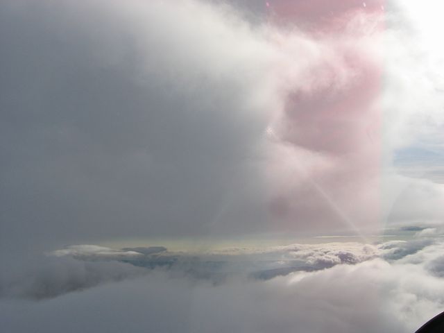| Looking up the Dee Valley early in the flight from above the Lochs. Smoke a useful indicator of wind direction. | Looking up at those inviting lenticulars as I climb rapidly towards 10,000 feet. (1) Over Tarland and (2) towards Loch Muick with iridescence visible in the reflection on my wing. | Catching the lenticulars at about 16,000 feet. A sundog adds to the atmosphere. | As I climbed above the lenticular beside me I saw a vivid glory with a shadow of the glider in the middle. | ||