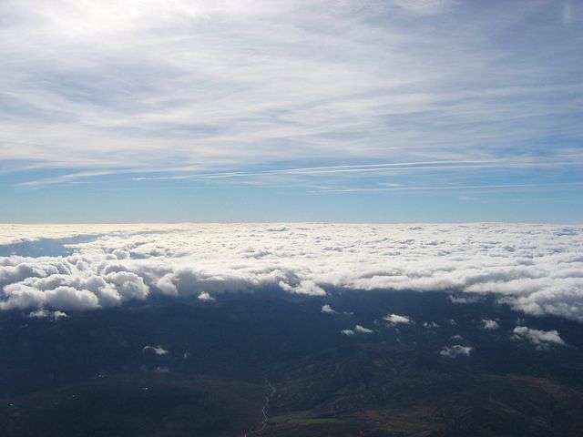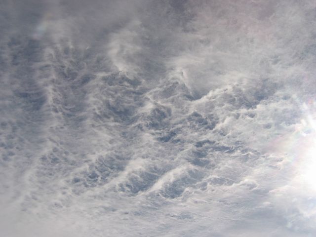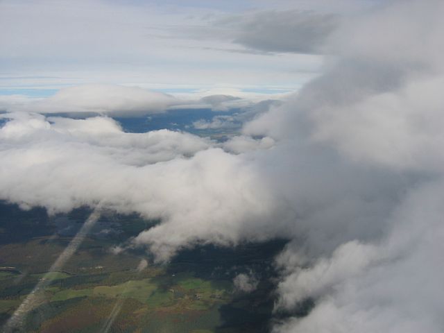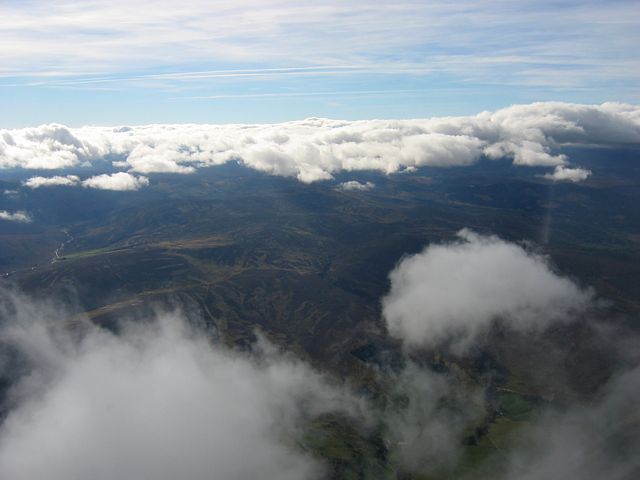 | Looking north from 8000 feet through a gap in the clouds to Morven. | To my west Ballater sits nicely under a wave gap. | Now in just NE (in the Lee) of Morven I climb past 15,000 feet. This time I got my canular straight. ;) Meanwhile I was eyeing the wave bar to the NW towards Corgarf. | Overhead and to the East this fantastic cloud web of filaments formed as I climbed slowly towards 16,000 feet. | ||