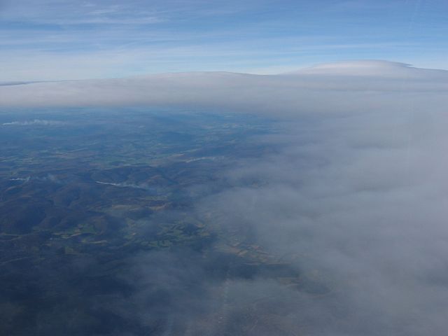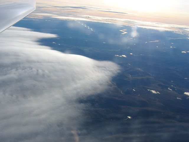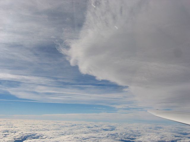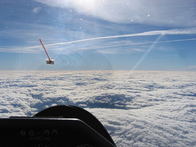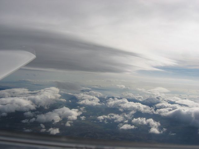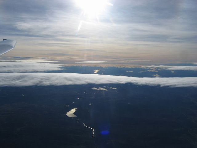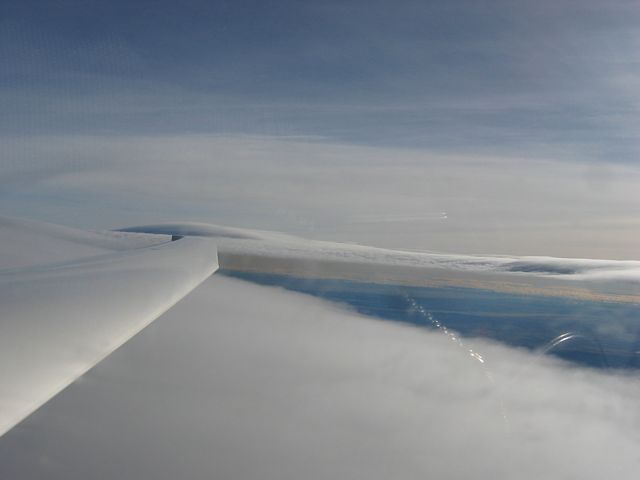 | Some interesting clouds as I climbed up the side of a lenticular at about 9000 feet. | My last high shot looking west from 15,000 feet as the wave decayed and the holes closed. Shortly after this I had to descend before the hole below me closed. | ||