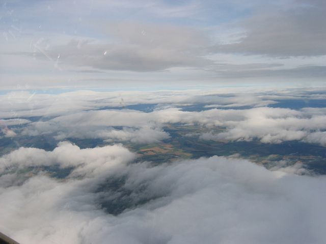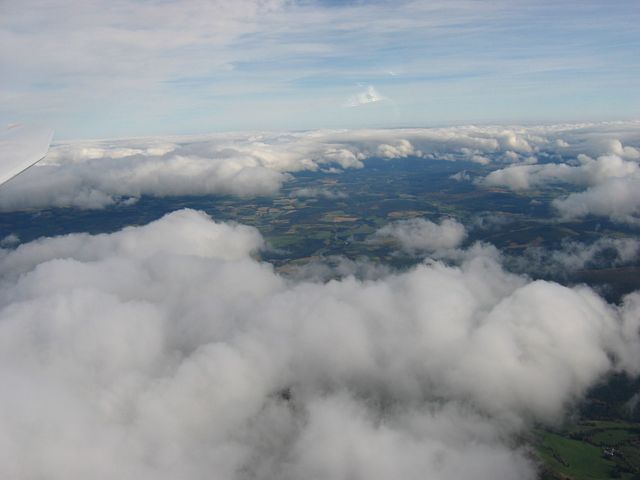 | Looking back to the Corgarf wave bar from the south. | Looking further East the wave holes formed an almost cellular structure. | As I descended I noticed lots of ripples on this cloud near Ballater. | Looking down at the airfield and surrounding area from the West. | About to descend below cloud top height. At this level they look like 2 huge mountain ridges side on to me with the 'valley' hidden from view. |