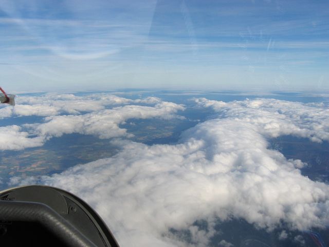| First pictures after launch. | Climbing up the side of a cloud in wave. | Looking NE. Tarland visible between clouds in centre of frame. | I had company up there. | ||