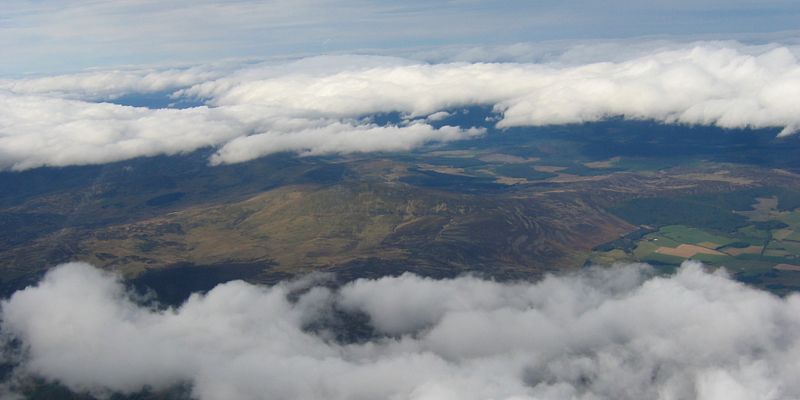 | First view up the Dee Valley (up right) and Glen Muick (up left). | Looking NE as I start to climb towards 10,000 feet. | Looking SW to Loch Muick. | Looking NE again as the lower cloud dissipates. | Looking SE towards Montrose from 19,000 feet above Loch Muick as the sun glints the distant sea. |