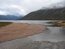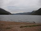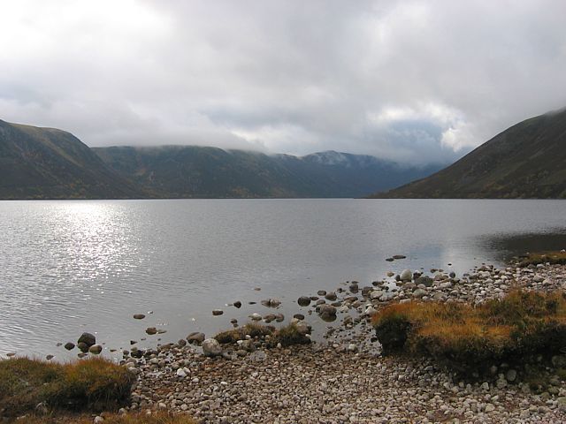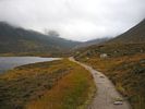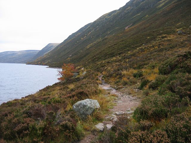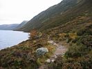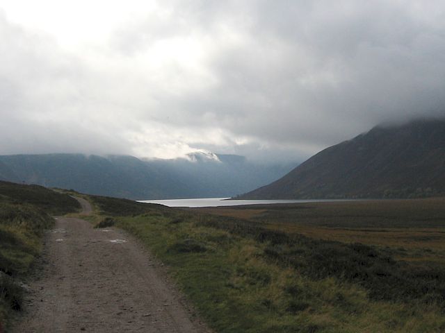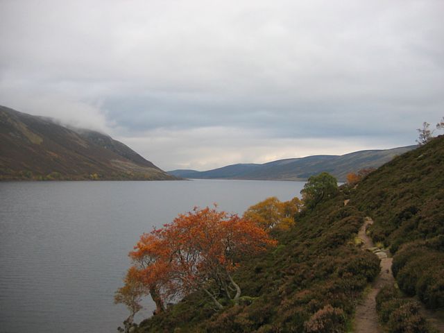 | The SW end of Loch Muick. | Low cloud 'smouldering' off the mountains on the north side. | Looking further up the glen towards Dubh Loch. | Loch Muick from the SW end. | Starting back along the southern path. | Another view ahead from the southern path. |