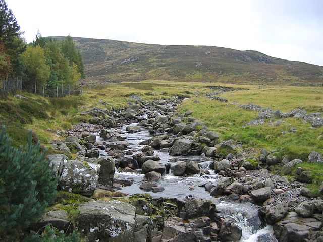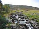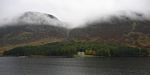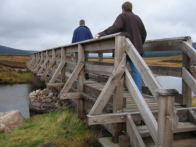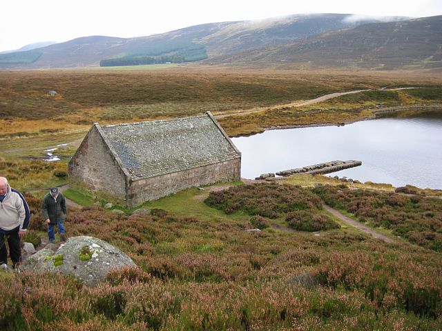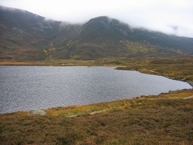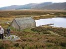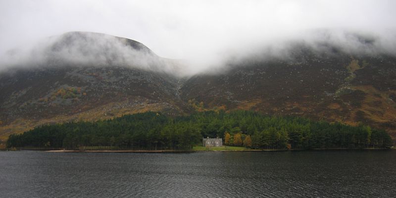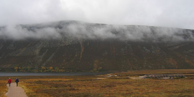| Crossing over a bridge next to where the River Muick flows out of Loch Muick. | There was a boat house at the NE corner of the loch. | More low cloud hugging the mountains above us. | Walking along the path on the northern side of the loch. | ||