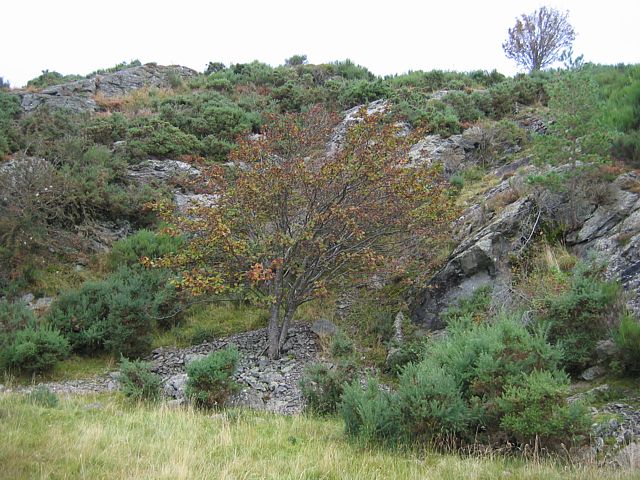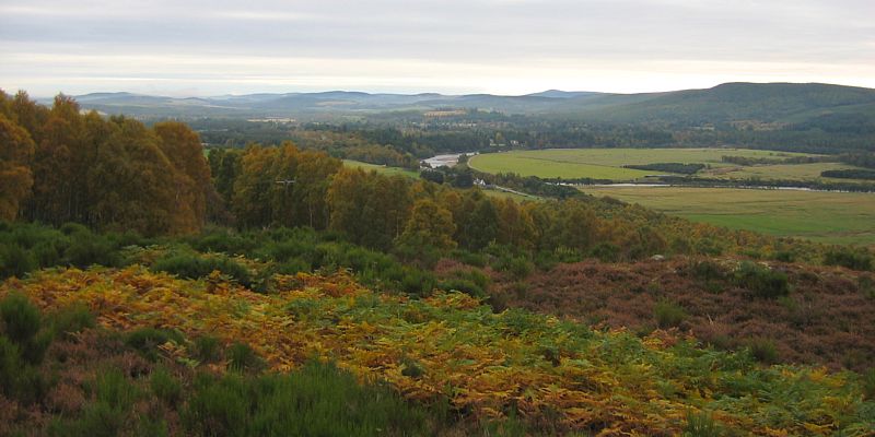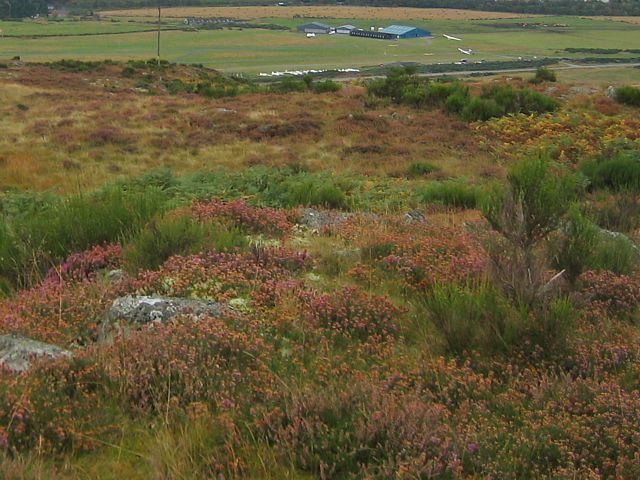 | Looking N to Tarland. | A montage of 4 shots of a Puchaz as it flew over Scar Hill on circuit and coming in to land at Aboyne. | A 3 shot panorama of the airfield. | Another shot of the colourful heathers with the bracken and other thicker vegetation below the rocks. | A Rowan tree growing in a bowl in the rocks behind a grassy ledge. | Mushrooms growing on a track on the way down. |