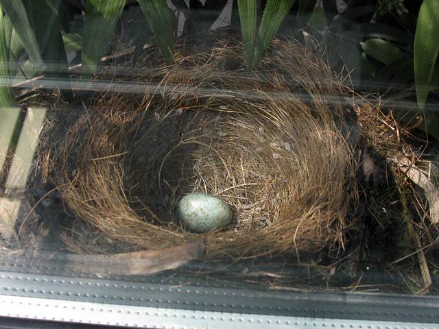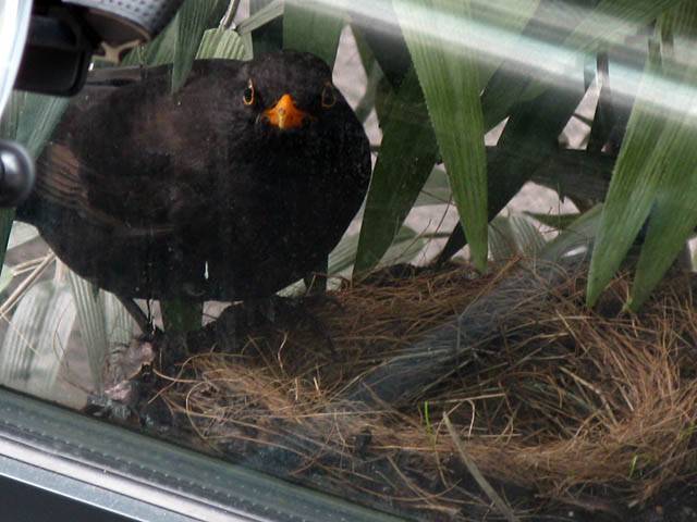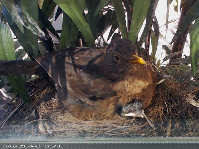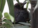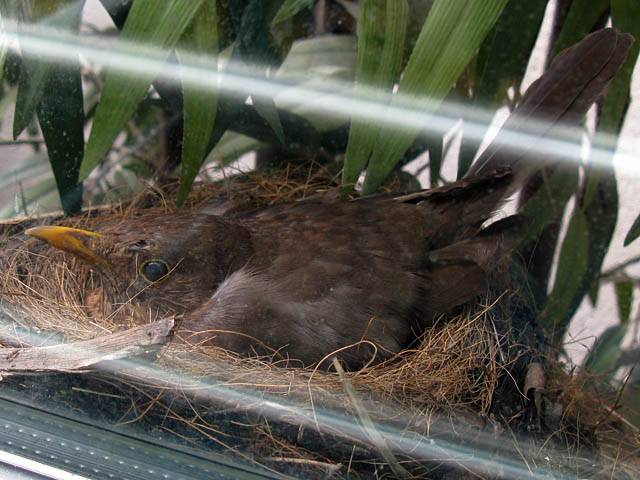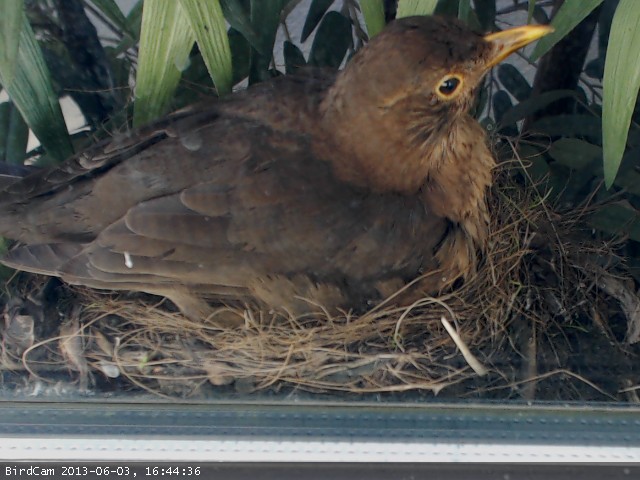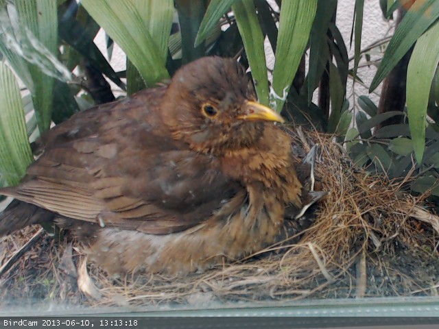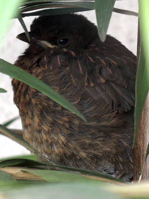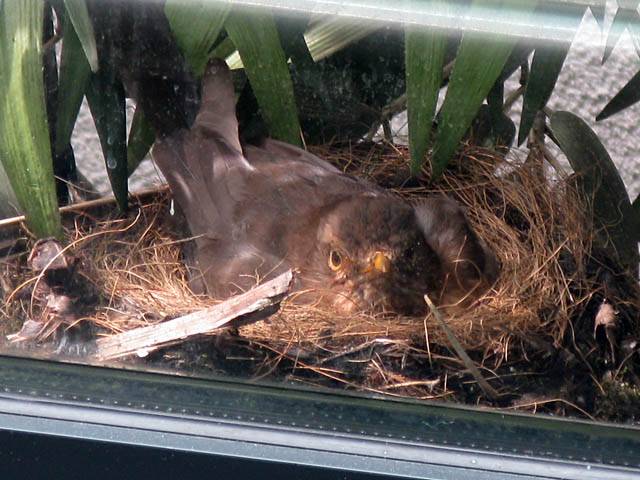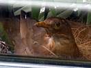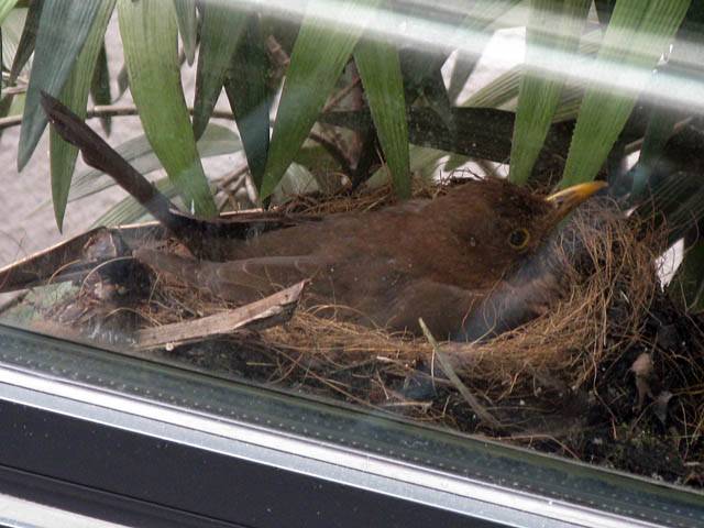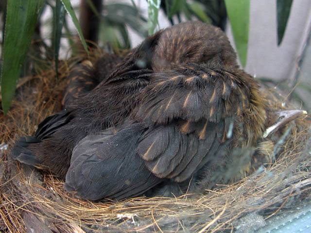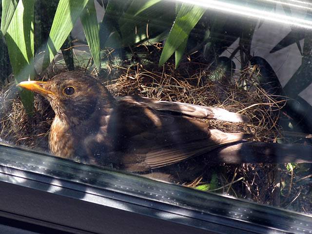 Resting after laying her first egg. | The blackbird vanished at lunchtime leaving behind a pretty green speckled egg on 14th. However by the time I left work it had been unincubated for maybe 5 hours. What a shame (we thought at the time). I wonder where she went? | The DPA Blackbird having a snooze at her 'desk'. Note that the reddish patch is down to sunlight reflections and nothing to do with pigmentation. |