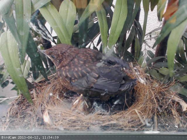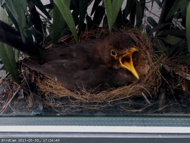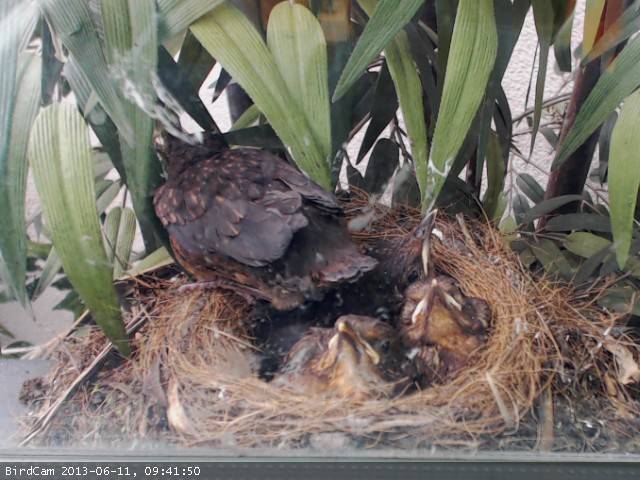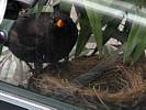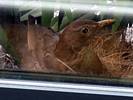 On Monday 20th May after returning from the weekend break there were still 4 eggs in the nest and now she is incubating the eggs and there almost all the time. A male Blackbird put in a couple of occasional appearances. Maybe it's the Dad seeing how she is doing? During the week a similar pattern continued, with much of the time taken by incubation, and the Male appearing to guard the nest when she was gone. So now we are hoping for hatchlings to appear before too long. The male should then join in and help with the feeding, judging from the literature. So watch this space...