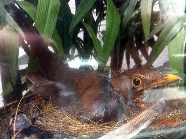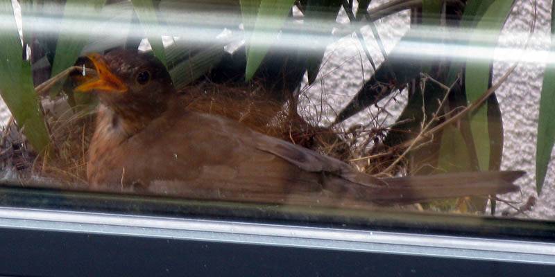 A Blackbird started building a nest on the window ledge right next to a busy office stairwell in Camden Town. I first noticed around Wednesday 8th May 2013. From just a small pile of debris the nest expanded into an exsquisitely fully formed creation over half a week.