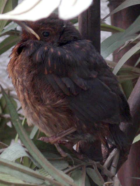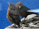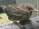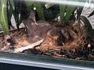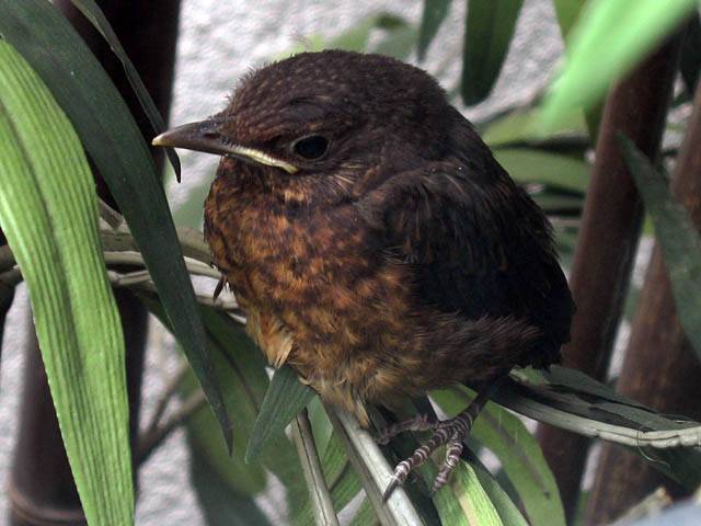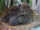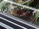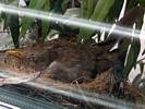 Sat on a branch below the nest just after fledging. | The other chicks enjoying the extra space in the nest. | Preening chest feathers. | The first chick exploring its new environment. Here on a pipe next to the aircon unit. Shame about the window reflections. |