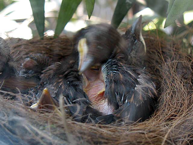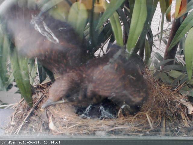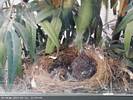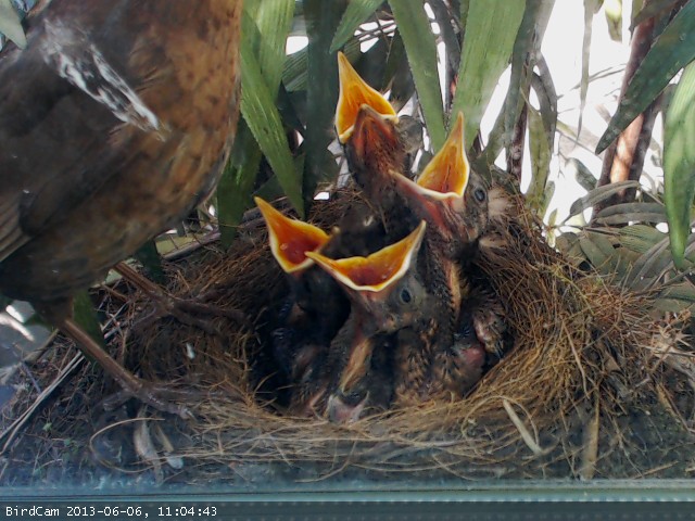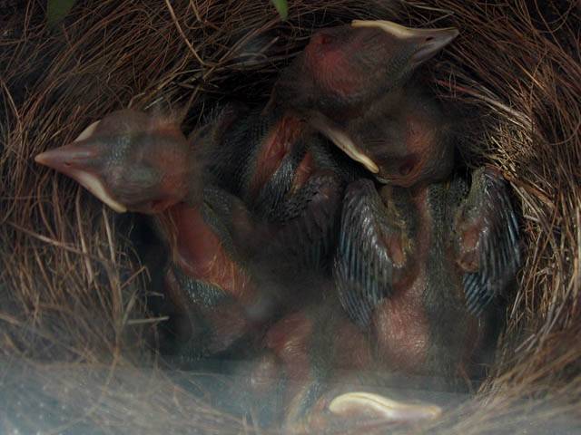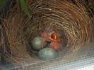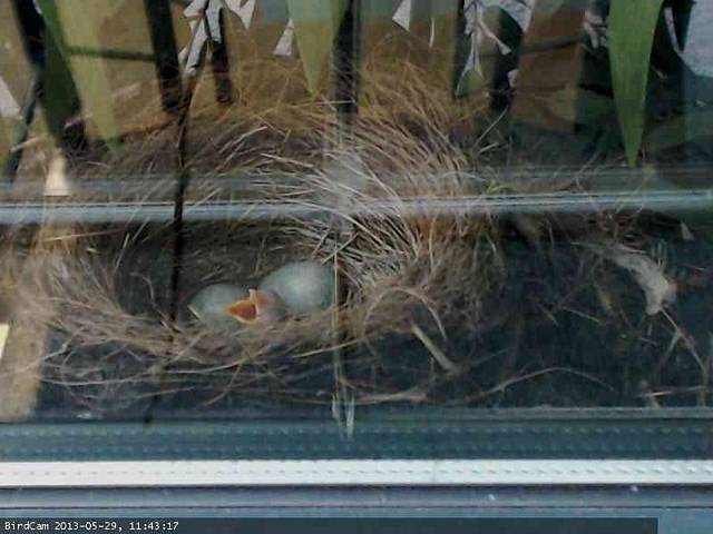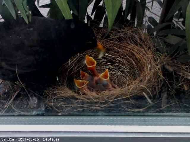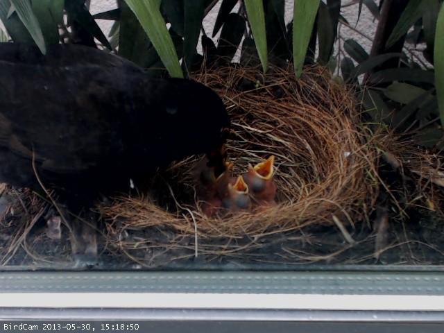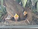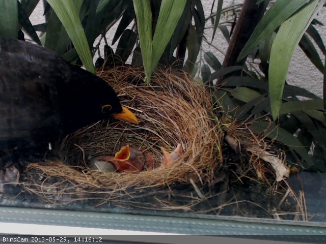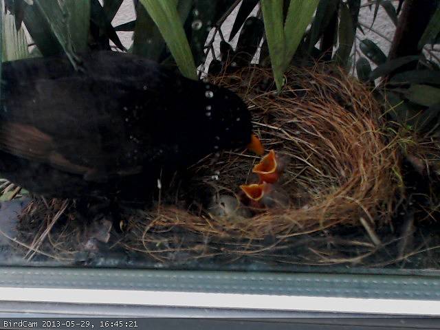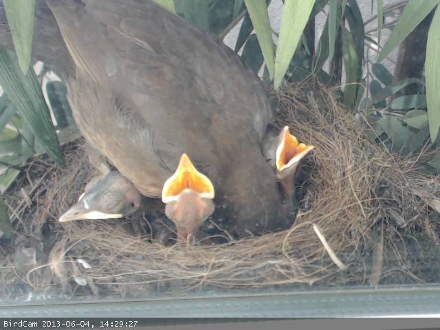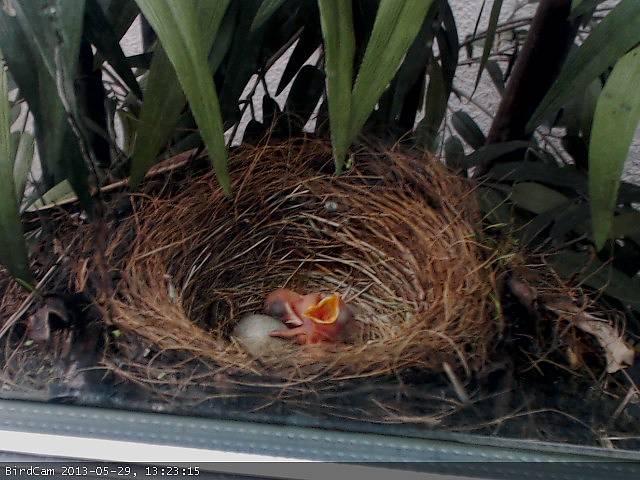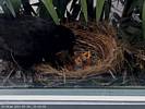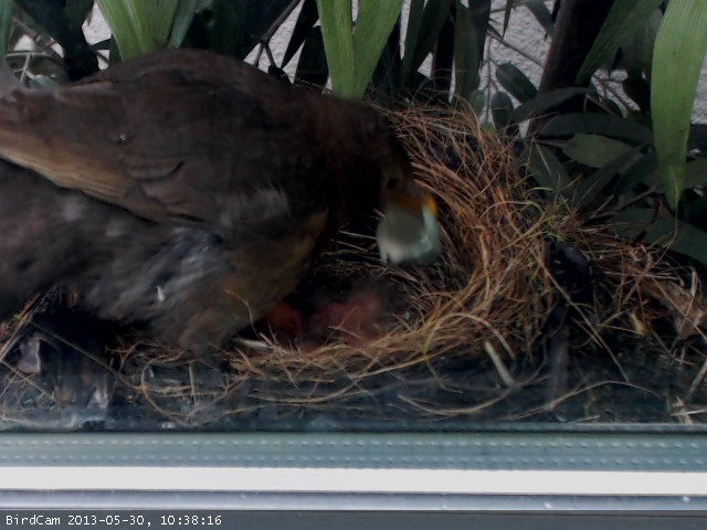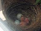 On 30th May there were indeed 3 hatchlings in the morning. I guess the 3rd hatched overnight. A crack was observed in the final egg, and that hatched around the 10:30AM mark. The mother was observed eating the final egg shell. Now the nest contains 4 wriggling lively hatchlings, begging for food which both parents are bringing to the nest. At one point the father brought a giant (by their standards) green caterpillar which it stuffed into the mouth of the first chick to open its mouth. The cycle continued. Mother would sit on the chicks for a while until a squawking male returned with a beak full of maggots, grubs, caterpillars, etc. He then fed the chicks and looked over them while the mother went off to get food. She then returned and sat on the nest. One less pleasant observation was that now and then a chick stuck its bum up and pood, and this was picked up by a parent and eaten! The few moments when the chicks were unattended were when I tried to take photographs with the main camera. In just one day the older chicks have started to grow a layer of down and started to grow. I expect by Monday they will look quite different.
