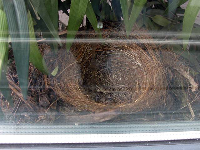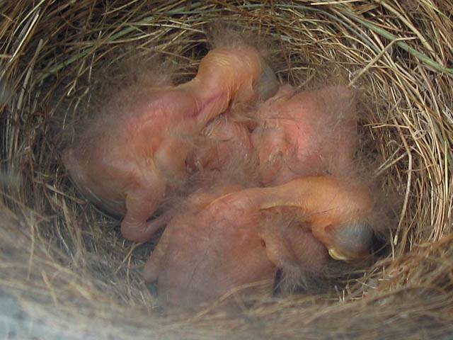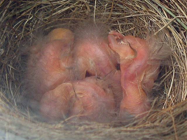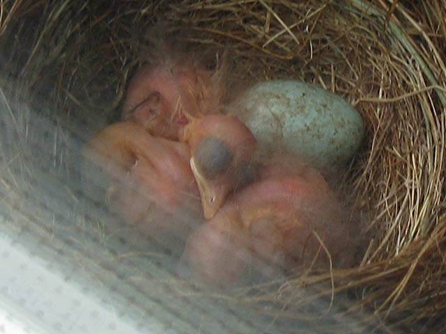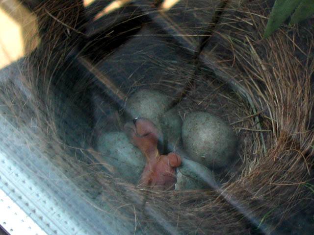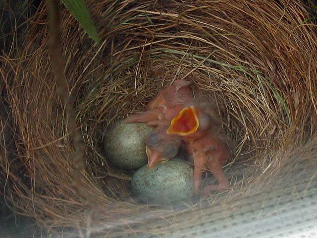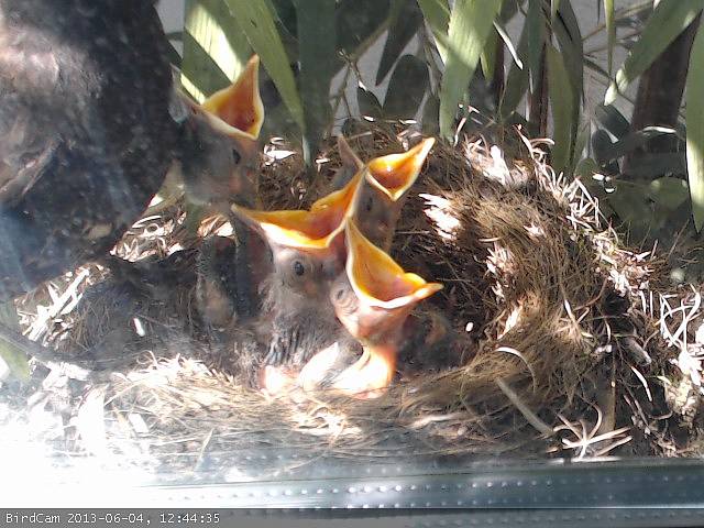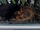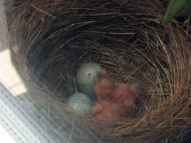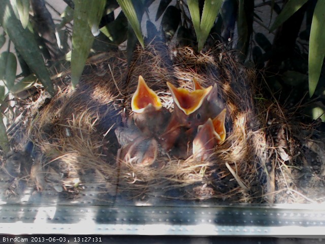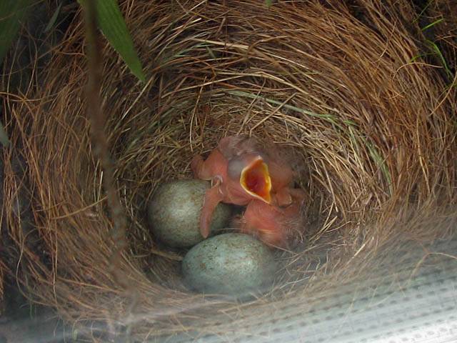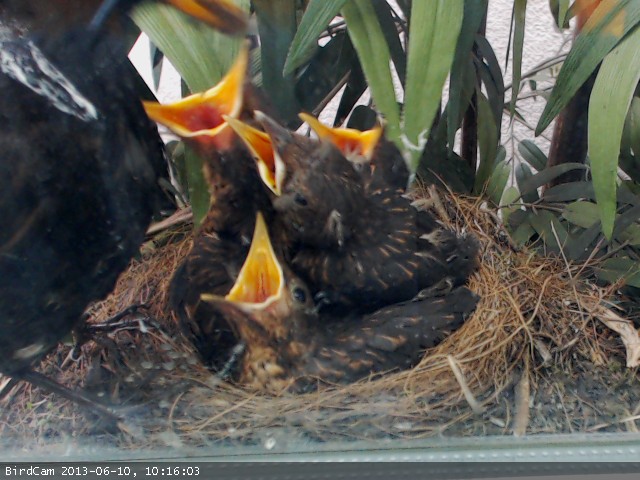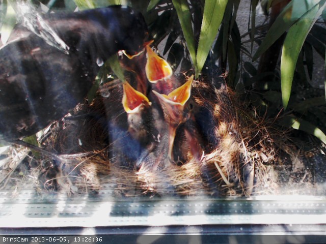 On 30th May there were indeed 3 hatchlings in the morning. I guess the 3rd hatched overnight. A crack was observed in the final egg, and that hatched around the 10:30AM mark. The mother was observed eating the final egg shell. Now the nest contains 4 wriggling lively hatchlings, begging for food which both parents are bringing to the nest. At one point the father brought a giant (by their standards) green caterpillar which it stuffed into the mouth of the first chick to open its mouth. The cycle continued. Mother would sit on the chicks for a while until a squawking male returned with a beak full of maggots, grubs, caterpillars, etc. He then fed the chicks and looked over them while the mother went off to get food. She then returned and sat on the nest. One less pleasant observation was that now and then a chick stuck its bum up and pood, and this was picked up by a parent and eaten! The few moments when the chicks were unattended were when I tried to take photographs with the main camera. In just one day the older chicks have started to grow a layer of down and started to grow. I expect by Monday they will look quite different.