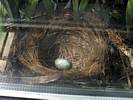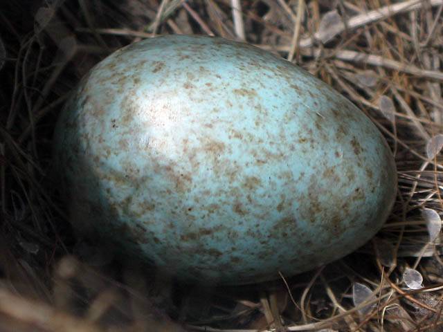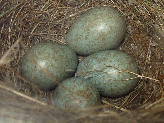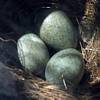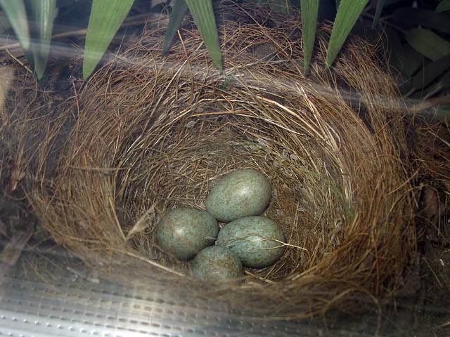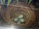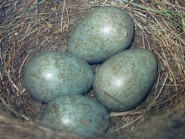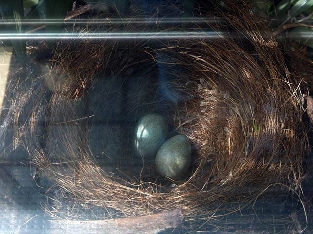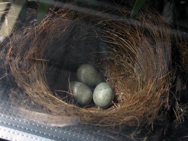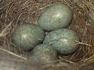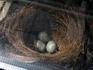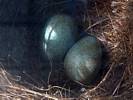 Well that explains why she was snoozing. She's gone to lunch and we can see a 2nd freshly laid egg on 15th. | Another view of the Blackbird as she continues her egg laying. | There are now 3 eggs! Photographed on 16th while a shaft on sunlight illuminates them at lunchtime. | Egg number 4 appeared around lunchtime on 17th. Light levels were very poor and reflections were bad so I decided to use the flash while there was no bird around to scare. |