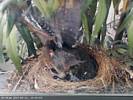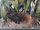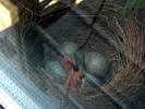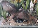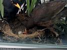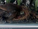 Mum flying off with a 2nd piece of shell as the 2nd chick hatches. I did see her eat some shell. I guess the calcium comes in useful. | Born hungry! | Eating eggshell. | Barely out of its shell and already posing for pictures. | The father starting to feed the hatchlings. |
