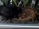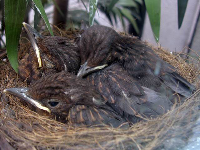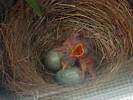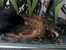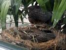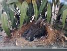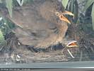 Two Blackbird hatchlings. The 2nd one was the one out of the egg observed to be cracked in the morning. | Feeding the hatchlings. | A hole appeared in the 3rd egg later in the day with a beak visible inside. | Feeding the hatchlings. Hole visible in the 3rd egg. |