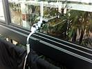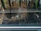 There were more chick moments on Friday 14th. At about 9AM I could hear a tweeting sound. I looked up at 2 open slanted windows to see one of the chicks on the frame between them looking into the office. No not good as I didn't want it to come inside. I grabbed a window pole and tapped it against the frame near to the chick. That encouraged it to fly away to safety across the wall. Then at about 10:30AM a chick (same one maybe?) tried to land on the window frame further along. It couldn't get a grip, and after some furious flapping it slid down a large slanted window pane before coming to rest on the side looking bemused. Meanwhile, one of the younger chicks stayed put in one of the fake trees all day. It had been there for 48 hours now not really moving. It was being fed by both parents and snoozed a fair bit. But why was it not exploring like its siblings?