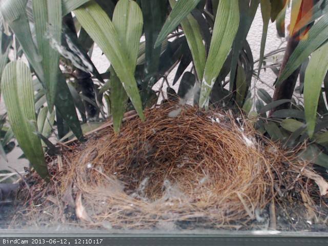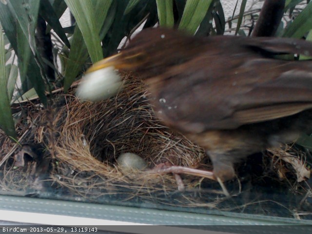 After lying empty for a day on Monday 13th, the bird returned. It was the same pattern on Tuesday and Wednesday. She arrived around the 8:30AM'ish mark, was seen resting in the nest, sometimes falling asleep, before vanishing at lunchtime, revealing a freshly laid egg in the nest. She'd return next morning to lay the next egg. After egg number 3 she started appearing more in the afternoon.