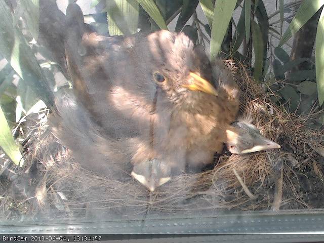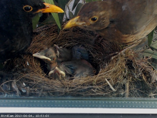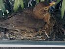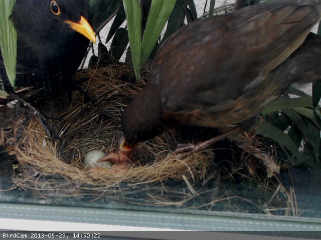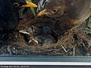 A crack has appeared in one of the eggs. | The father checking up on the nest. | The first view of a newly hatched chick on Birdcam, a webcam set up in the office. A moment earlier I saw mum fly off with a piece of shell and knew that was the moment the first chick hatched. | A newly hatched Blackbird chick. |