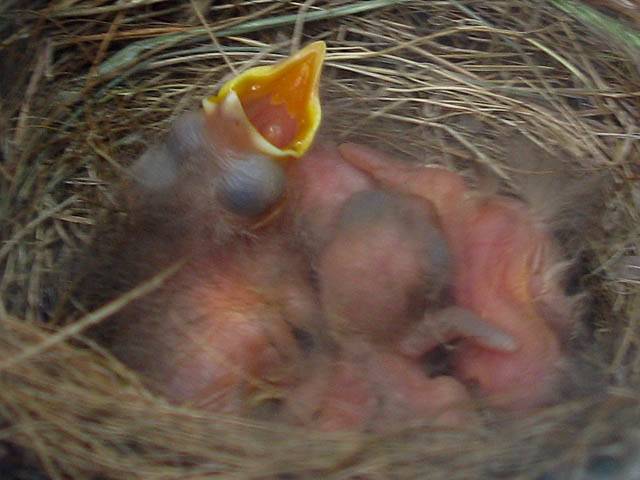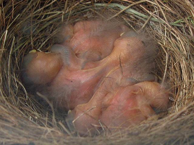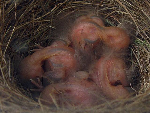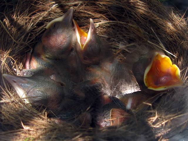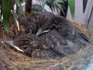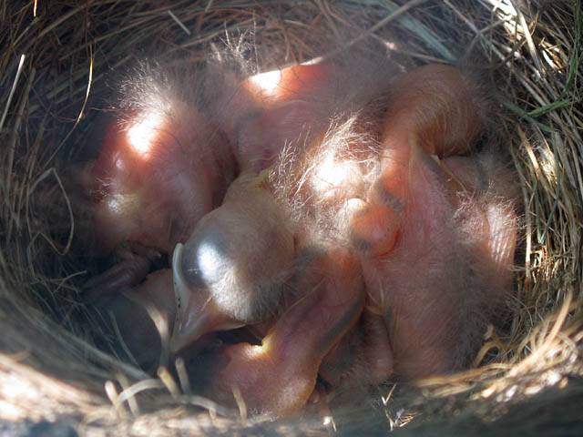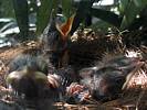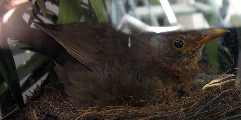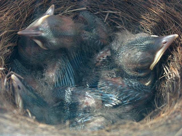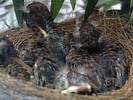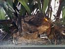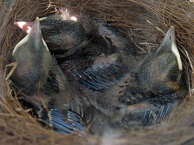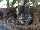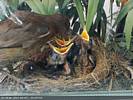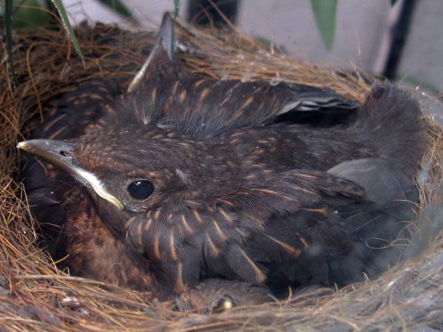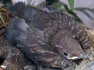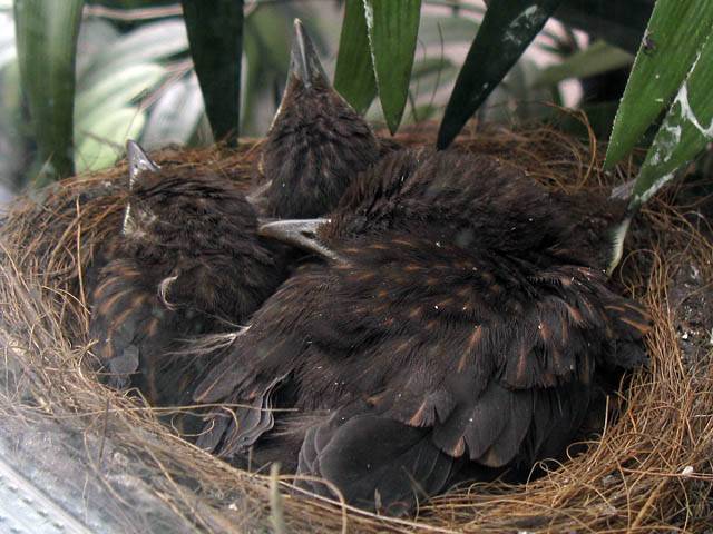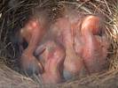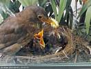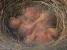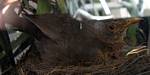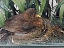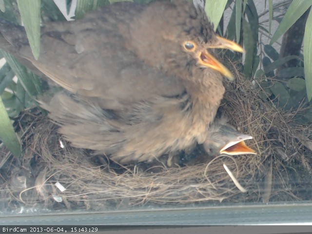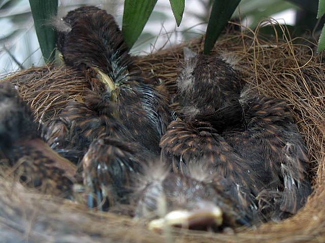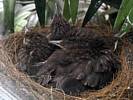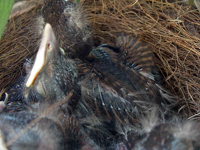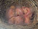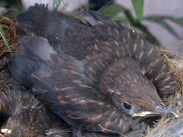 Look how long the feather barbs are getting now! | The chin of an 8 day old Blackbird chick. | Feeding time. | Mum brooding the chicks. |