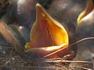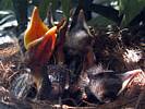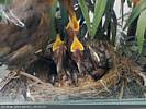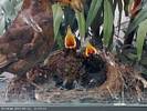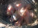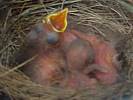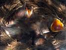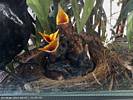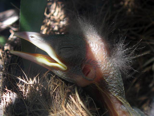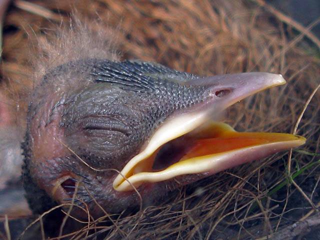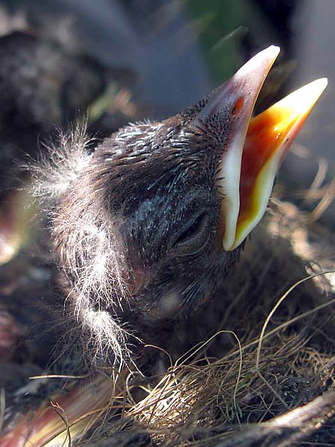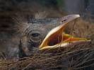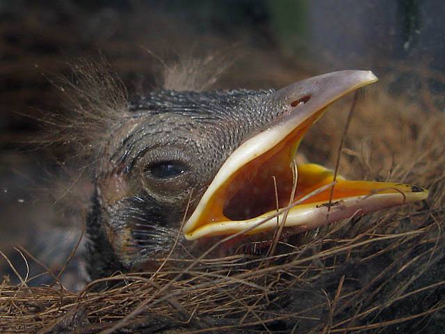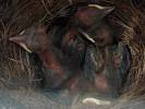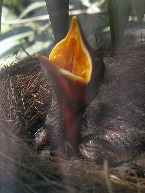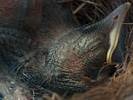 At last I got a closeup of a head with open eye. They still keep their eyes closed most of the time when resting between feeds. | Another closeup of a chick raising its head for feeding. | Looking down the mouth of a week old Blackbird chick. |