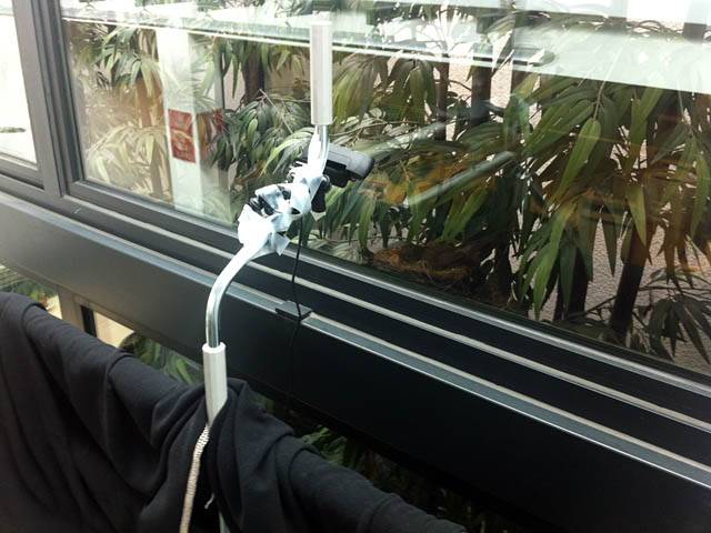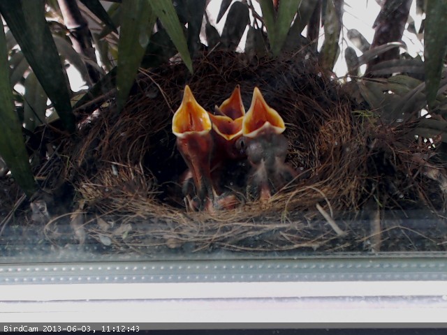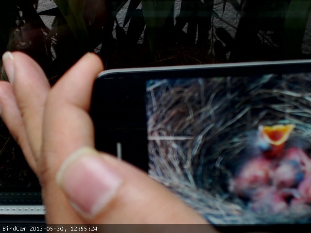 One more shot of the chicks huddling between feeds. | Birdcam in action. It is a Logitech C920 webcam attached to a gorillapod which has been mounted on top of a window pole, with tape stopping it from slipping. The pole is attached to the staircase handrail by string and more tape. The black cloth was draped over the rail to reduce the severe reflections, and worked a treat. The webcam is attached to a PC downstairs running Yawcam software. Alas the webcam is only accessible from within the company network. Apparently it is a hit across the company, including in the head office in Hopkinton, Massachusetts. | Feeding time. | Birdcam spots Dad feeding the chicks. | Mum brooding the chicks and having a yawn. |