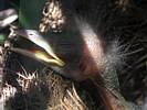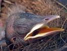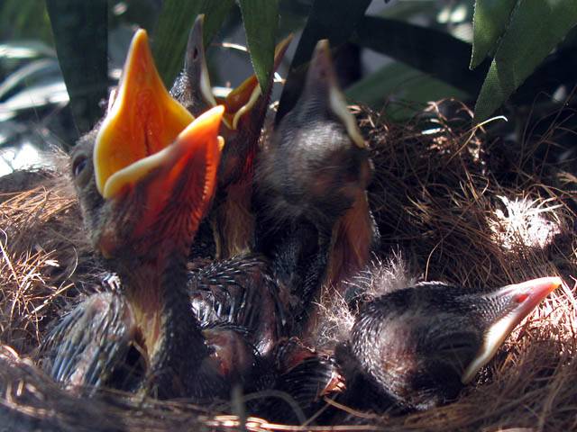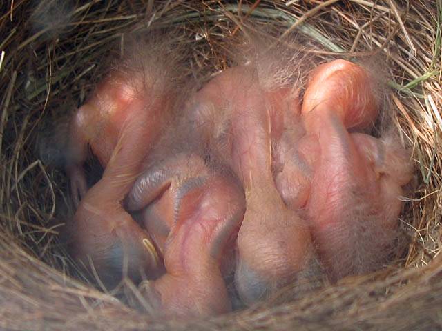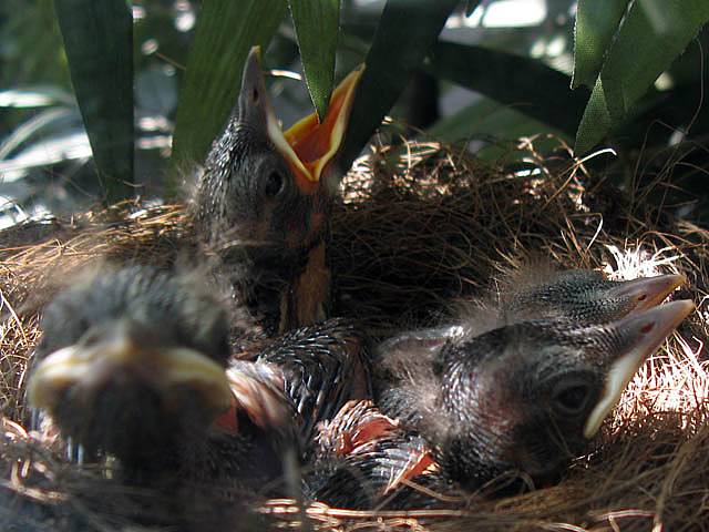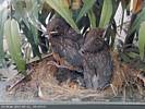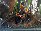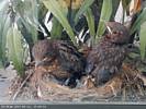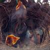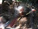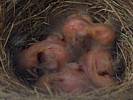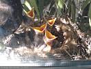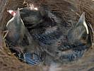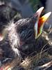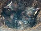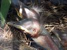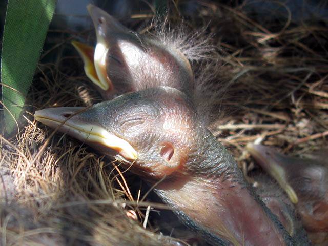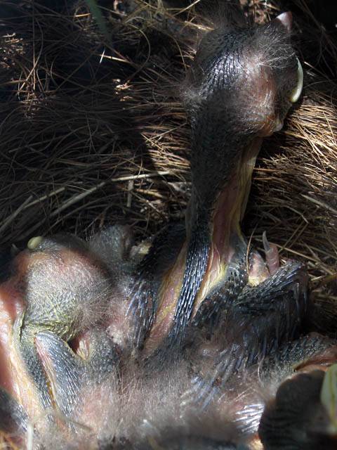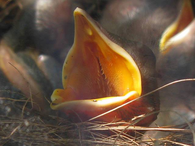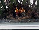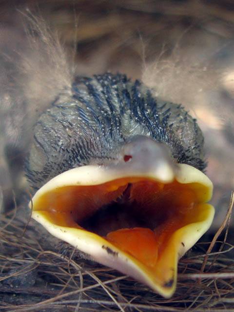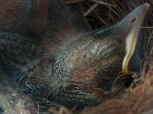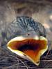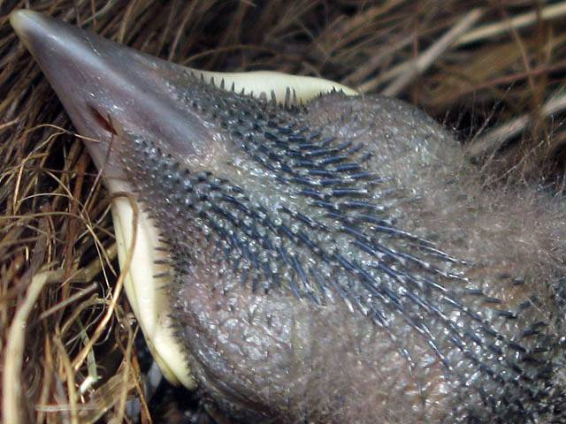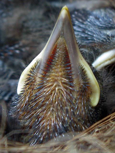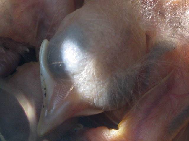 Eyes opening. All 4 mouths open. | Those 5 day old chicks haven't half grown over the weekend. Darker, bigger, growing flight feathers, and eyes starting to open. | Closeup of the heads of two of the chicks. | Closeup of the mouth of one of the chicks. Interesting roof of the mouth with those hooks. Could it be to ensure food can't escape once placed inside? |