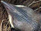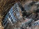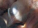 Looking at the chicks you can see the feather 'stubble' growing nicely from the head, down the neck to the wings and back. | The youngest chick slightly behind the others but still doing OK. | Mum brooding the chicks. | Head stubble closeup. | Closeup of the head of a chick. |
