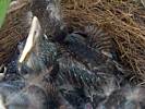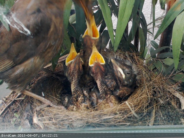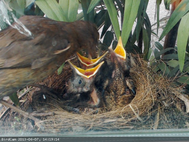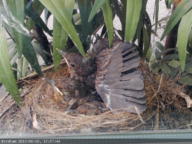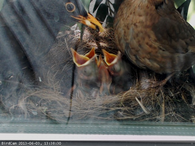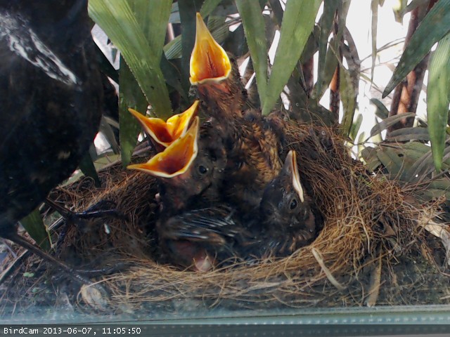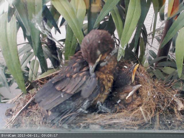 On Monday 3rd June, after the weekend, the chicks had changed considerably as expected. Much darker and bigger, flight feathers growing rapidly on the wings, and eyes just starting to open (most noticeable when being fed). They were ravenous and poor old mum and dad were run off their feet bringing them food, food and more food. Now and then mum still sat on them. She was visibly higher up in the nest than last week, and couldn't sit still for long before a chick wriggled or poked a head out. Throughout the week the chicks continued to grow bigger, more hungry, and started to grow their feathers. By the end of the week they were starting to look more like real birds, a far cry from the lumps of raw chicken look a week ago. They were also preening the new feathers a lot and on Friday one of them had started to exercise its wing muscles.