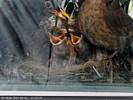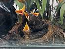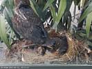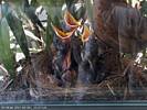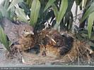 Mum trying to feed the chicks a crisp. It won't fit, but she keeps repeatedly trying. | At 9 days old are these chicks starting to get close to fledging? Preening and starting to exercise wings. |