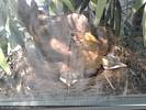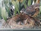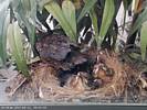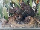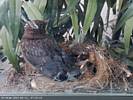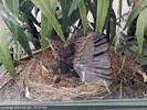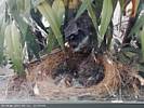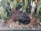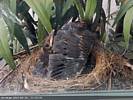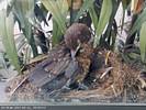 Two of the chicks sat in branches of the fake trees on the patio near the nest. | Mum checking over one of the chicks just after feeding it. | One chick snoozing while the other observes. |