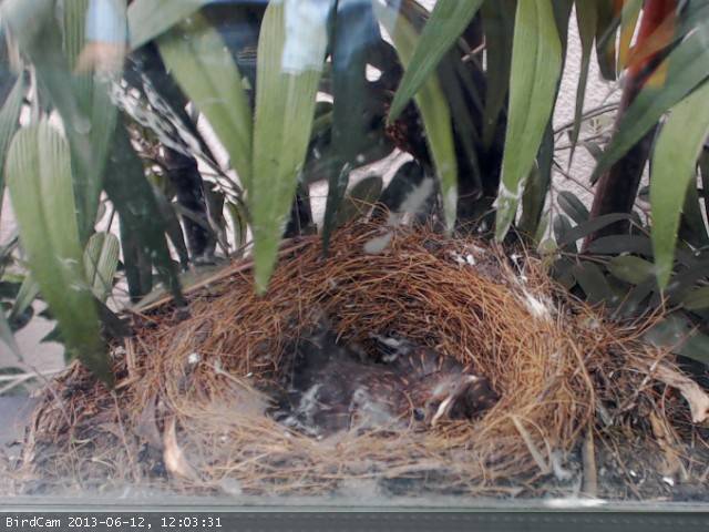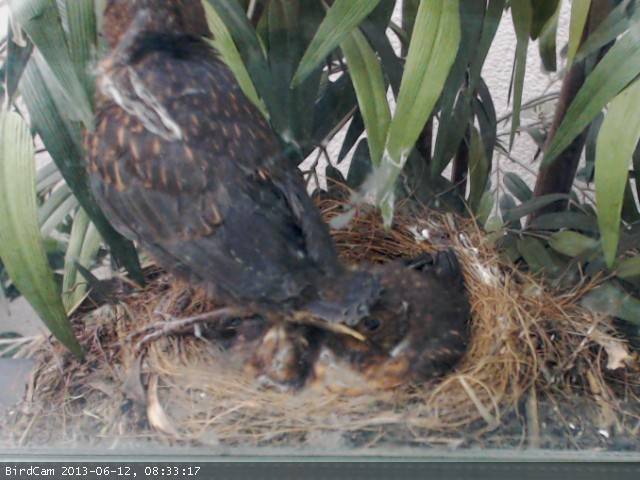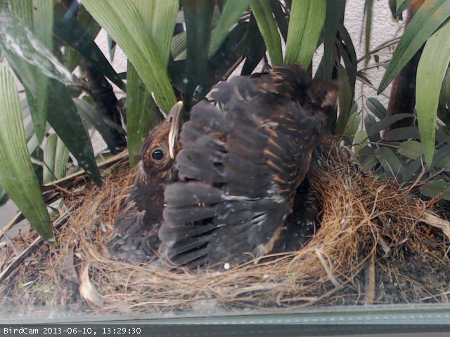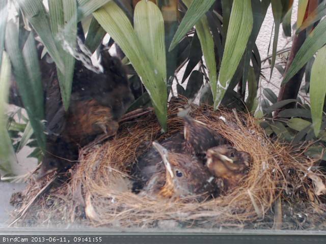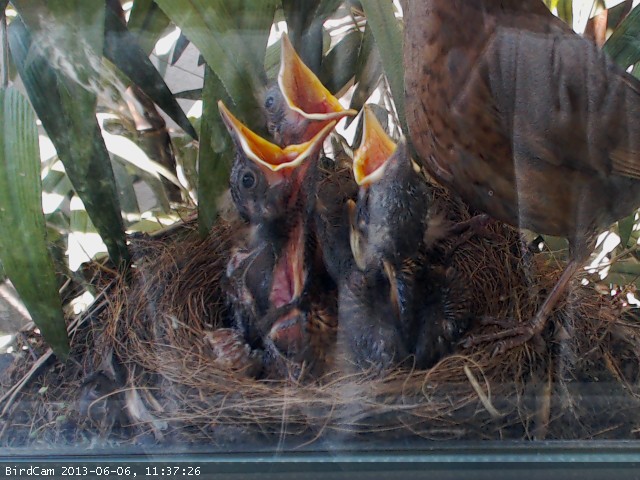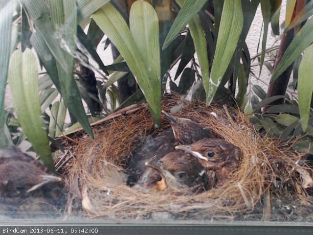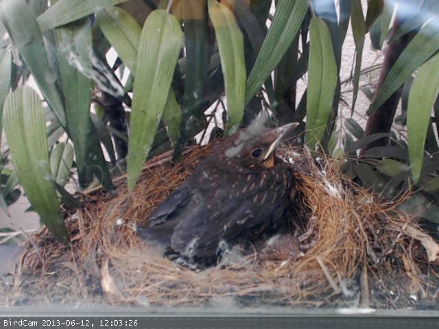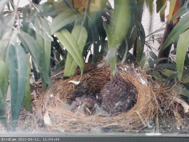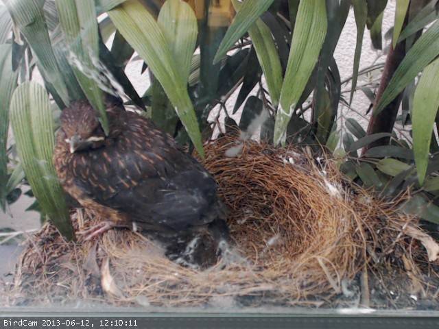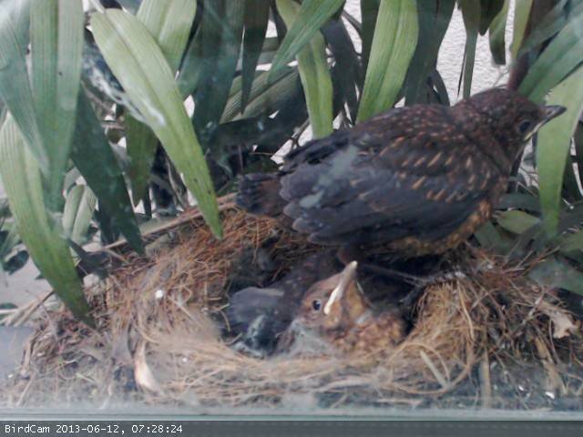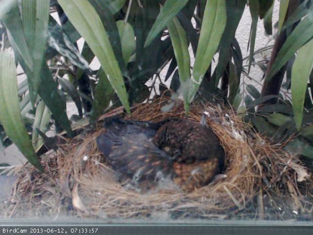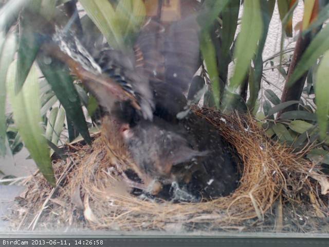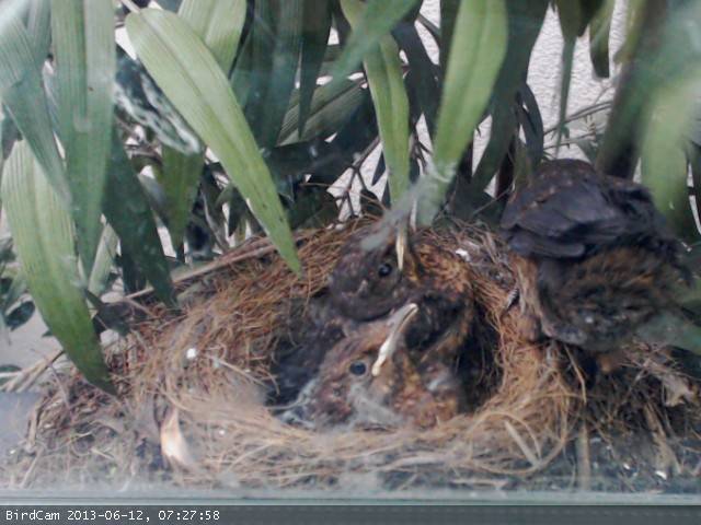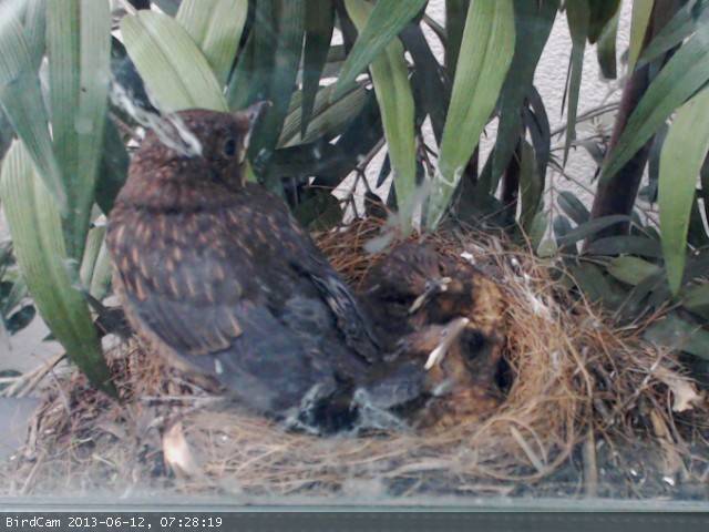 Tuesday 11th was fledgeling day! All morning the chicks had been getting increasingly restless, preening their feathers and stretching and flapping their wings. Then one chick hopped out of the nest onto the window ledge before hopping back in. A short while later we saw it go over the nest wall to the back and disappear from the webcam view. A short while later it was seen on a branch just below the nest. It eventually found its way to the ground safely. It can barely fly, and is rather clumsy, but learning fast. I saw mum feed the chick on the ground near the aircon unit. The chicks in the nest meanwhile were also restless. One chick stood up on top of the nest rim several times during the afternoon but never seemed quite bold enough and retreated back into the nest. The 3 remaining chicks were still in the nest when I left at 5pm, and seemed to be enjoying the extra space left by the fledged chick.