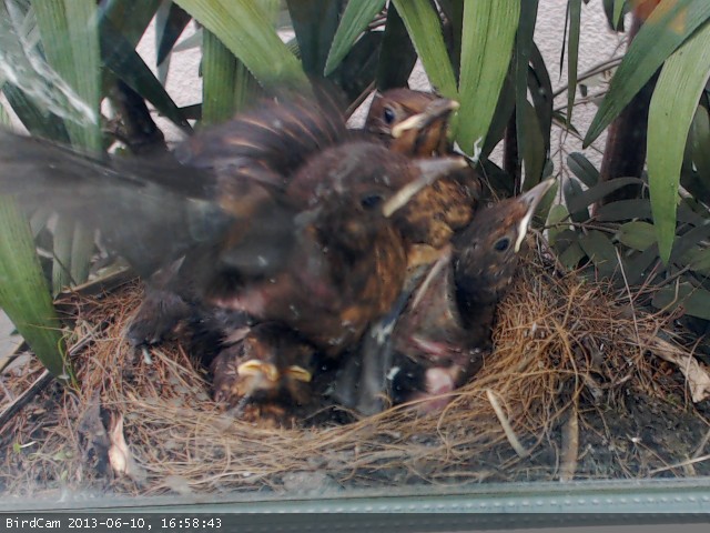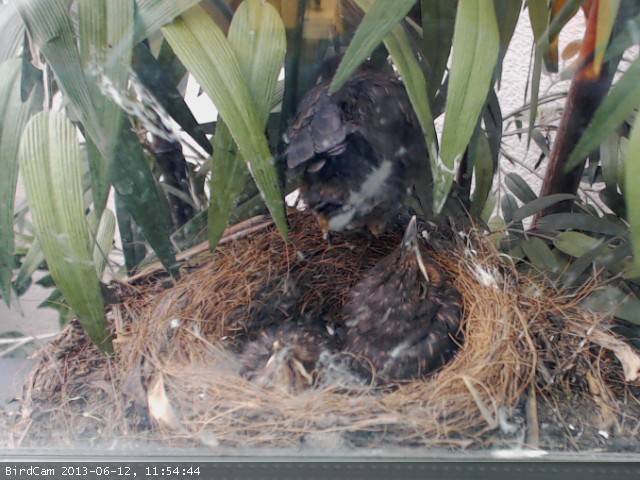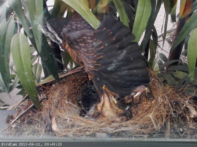 Mum is still brooding the chicks now and then. But there isn't much room there any more. | Some great webcam captures of wings outstretched. They almost look airworthy now. | Exercising the wing muscles. |