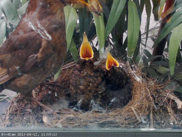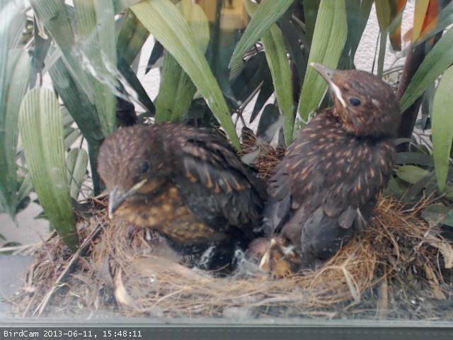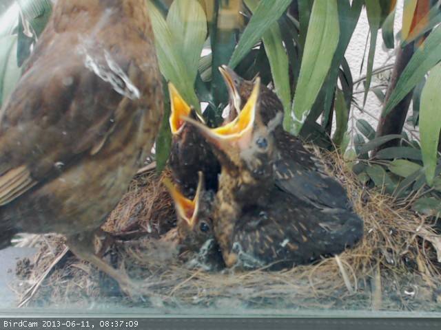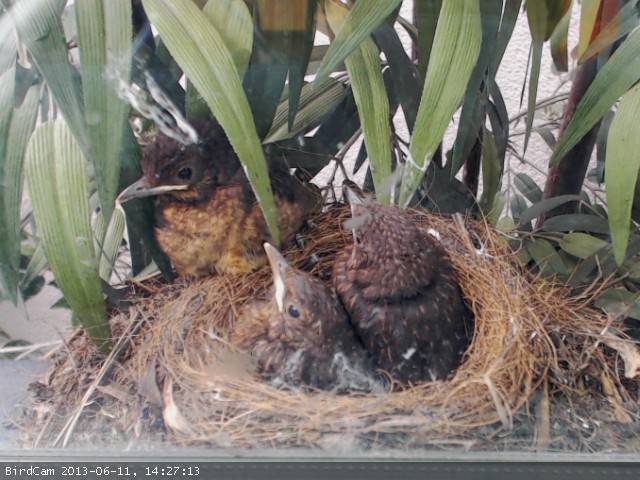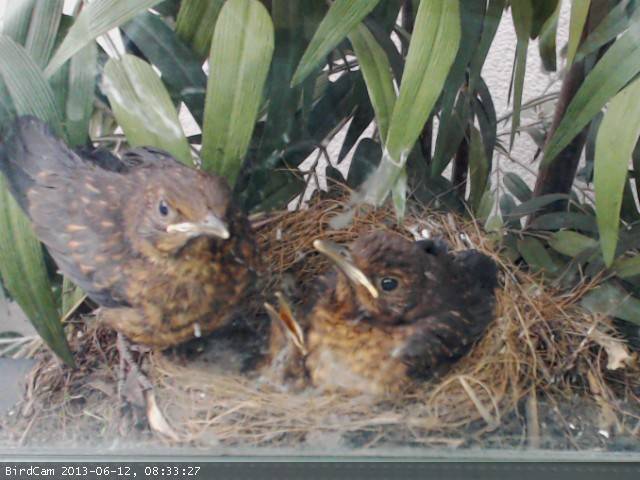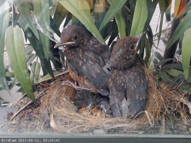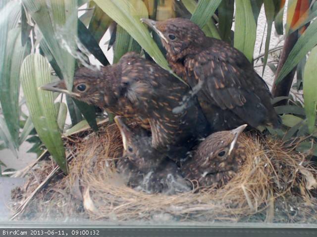 On Wednesday 12th I wasn't in the office, but I was able to review the webcam screen grabs. As expected the remaining chicks all fledged within 20 minutes of each other at lunchtime (11:54, 12:03 and 12:10). Chick 2 had been seen to leave the nest and the return a few times during the morning before it finally left for good. Then the 2 remaining chicks followed their bolder siblings out of the nest soon after. So this is the end of the nest story. The chicks have successfully been reared to the point of fledging right in front of our eyes. Now it will be much harder to follow them as they disperse away from the nest. It is possible they might stay close by for a while, but as they learn to fly they will soon vanish for good. This was an amazing opportunity to see nature in action. Springwatch eat your heart out!