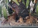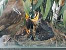 Chick 2 stepping onto a branch before returning again. | Chick 2 leaving the nest for the last time. | And then there were just 2 chicks left. |