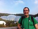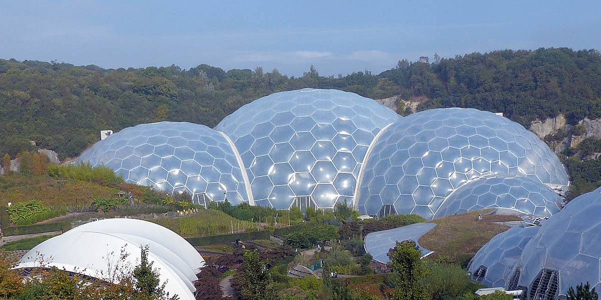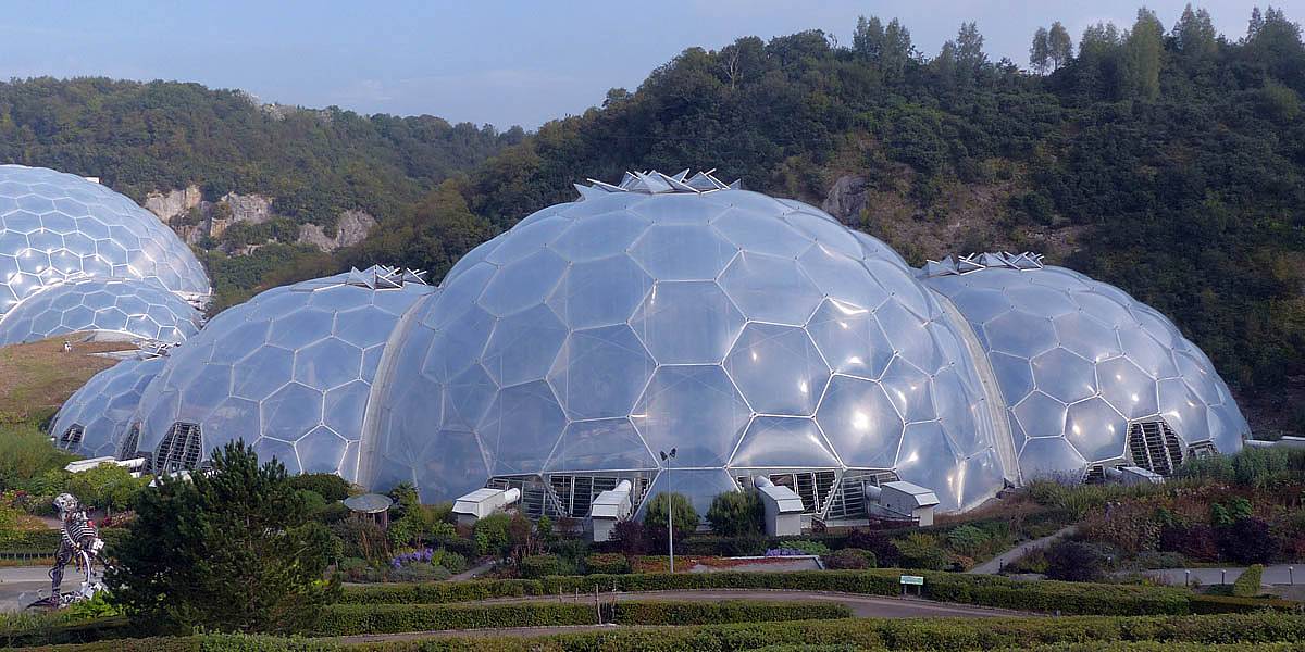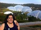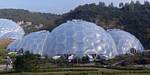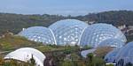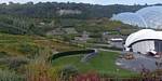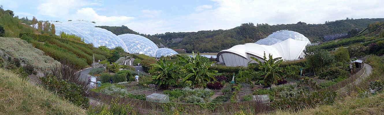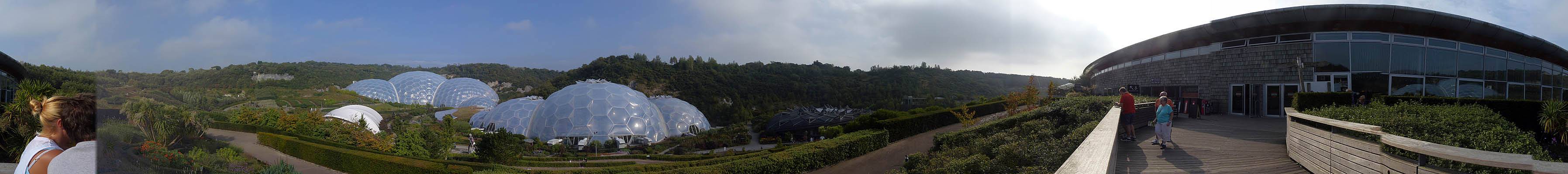 Entering the Eden Project's visitor centre. | Renée and Mike at the Eden Project, which is set into an old bowl shaped quarry. | 360 degree panorama of the view from the visitor centre. |