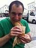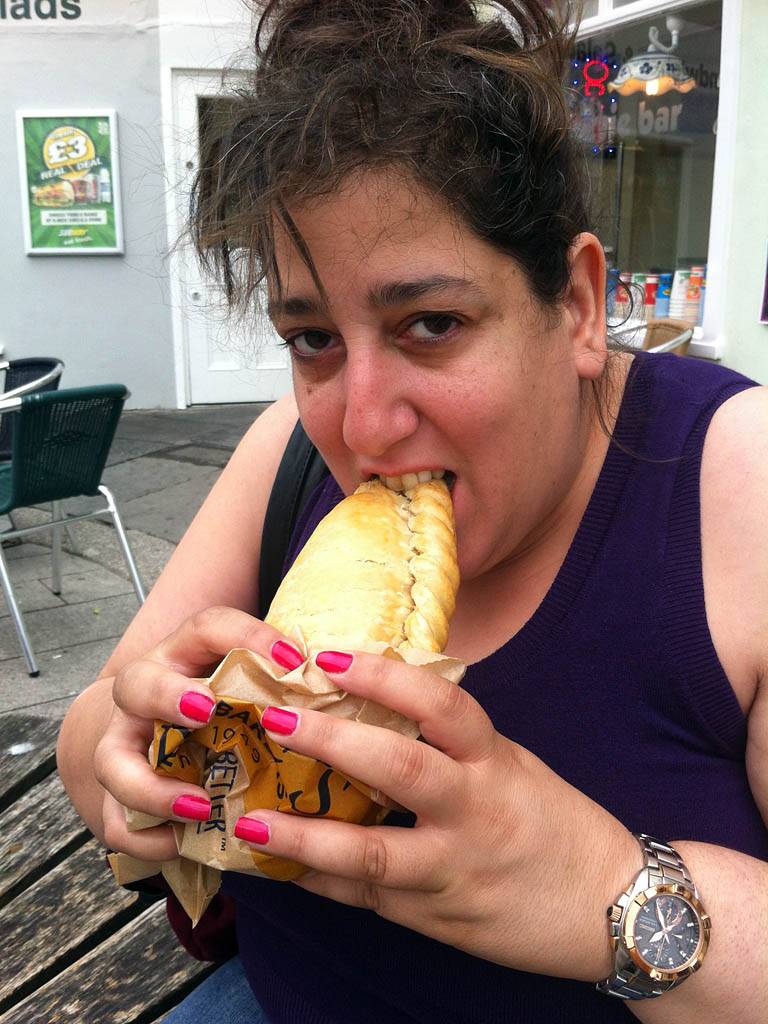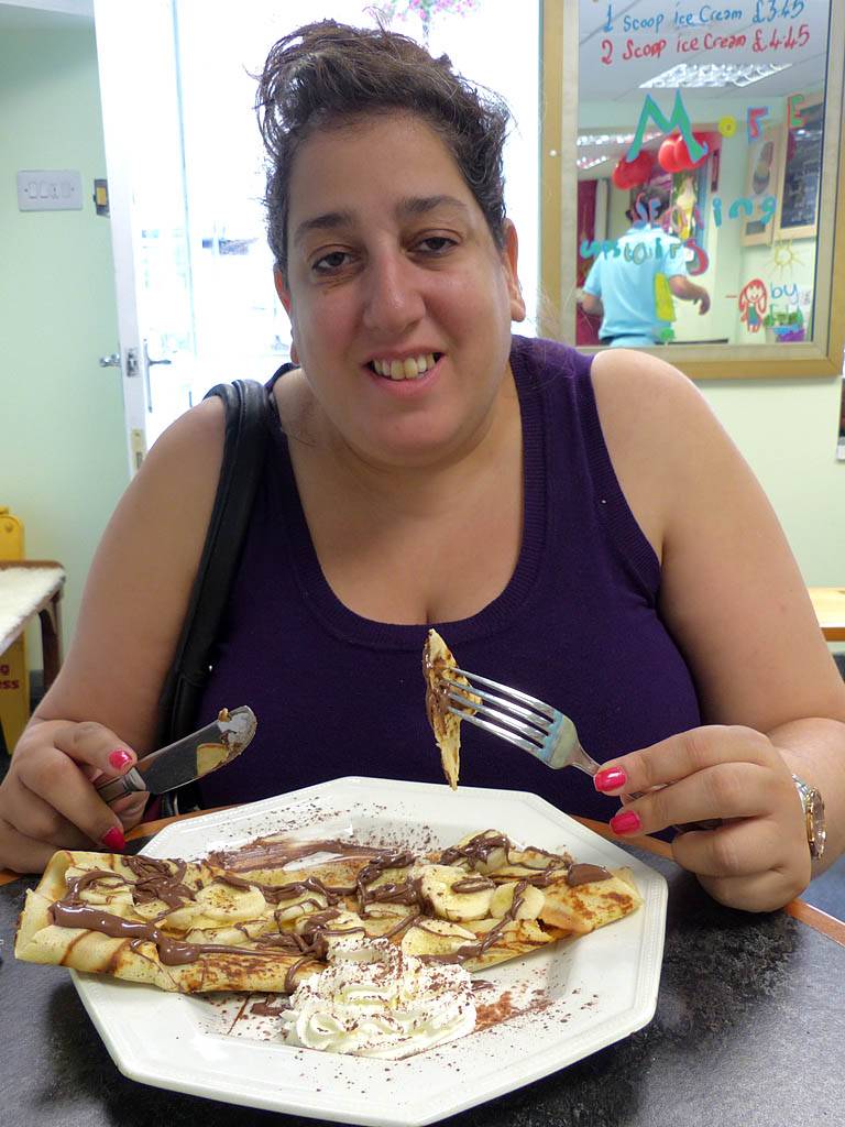 You can't come to Cornwall and not have a pasty. We duly complied! Yum! | A local hoping to benefit from and crumbs dropped. | Renée enjoying a banana and nutella crépe. |