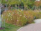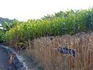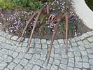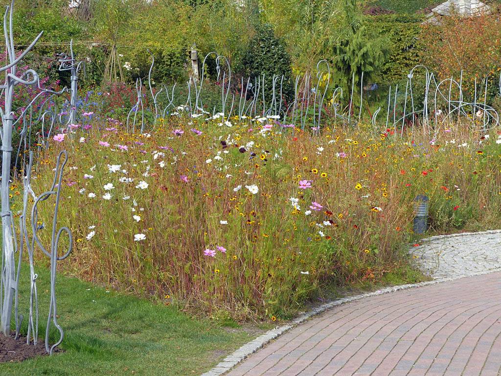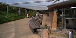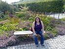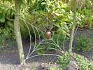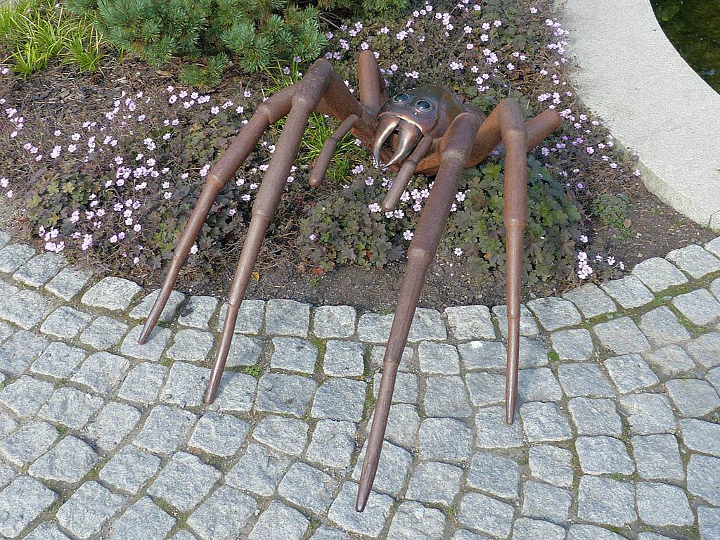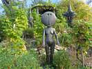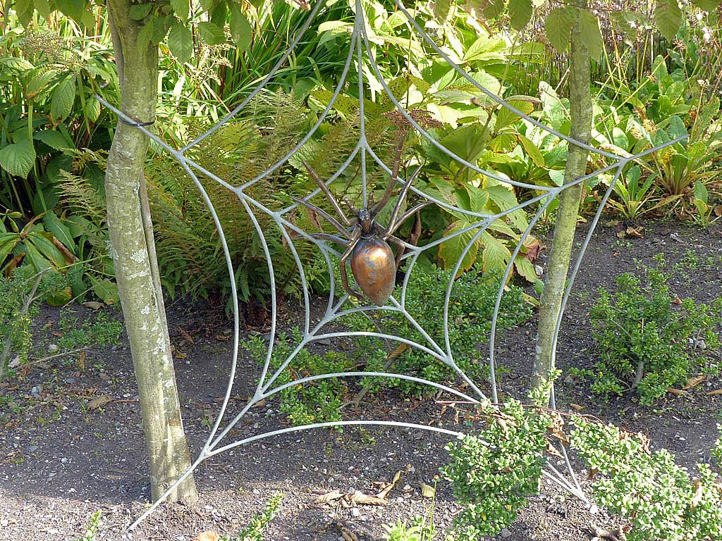 A cool spider sculpture. | Renée enjoying a scenic bench. | A water feature by the bench and spider sculpture. | Wild flowers. | Another spider sculpture, this time on a web. | Maize and corn growing in a demonstration display. |