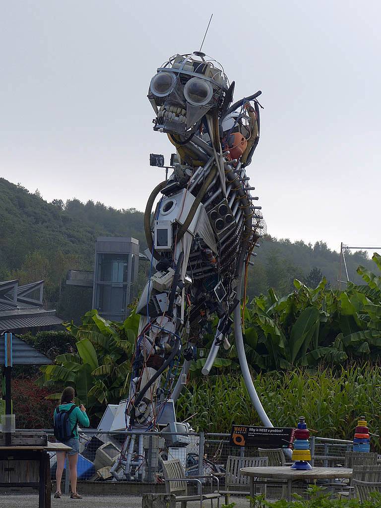 A sculture made from waste products. | Getting close to the biomes. | A nice bee sculpture. | Inside the food hall from where we enter the biomes. |