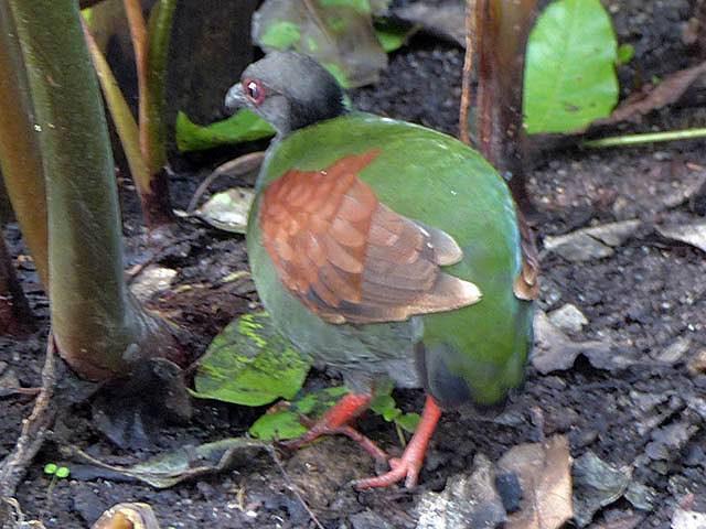 Some mobile art above the walkway. | Another view from the Rainforest Canopy Walkway. | One of several tropical birds in the biome. | Another pretty tropical plant. | Big waterfall at the top of the biome. |