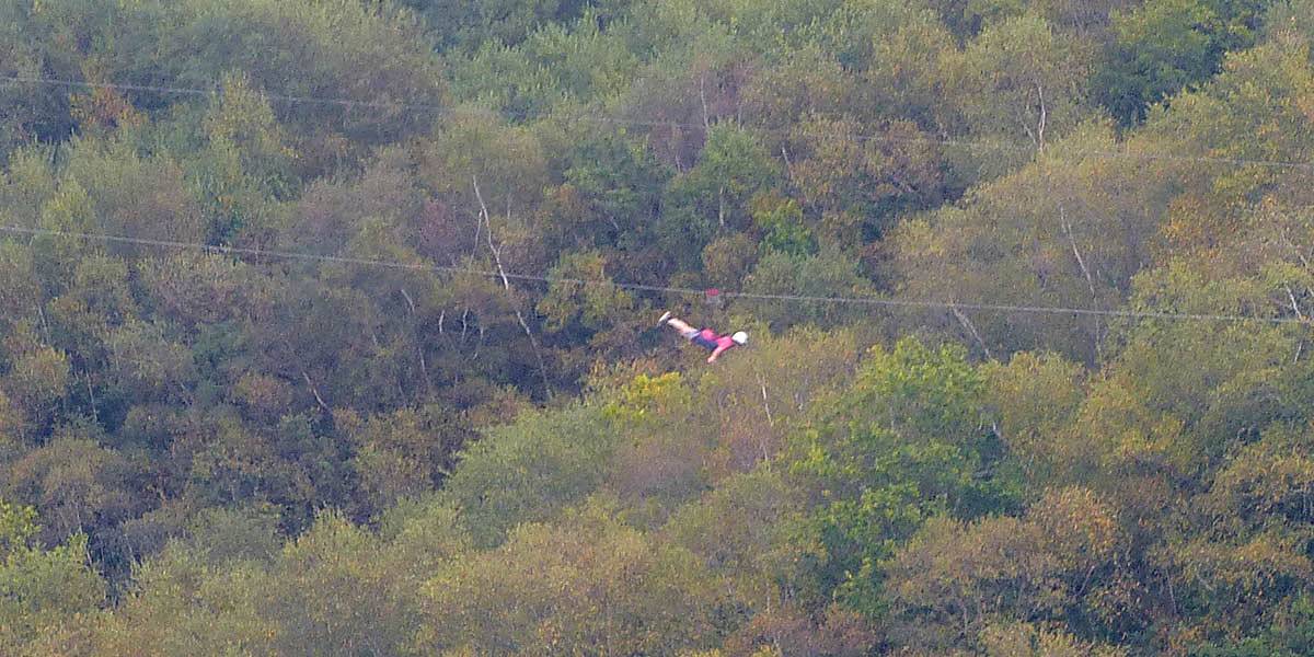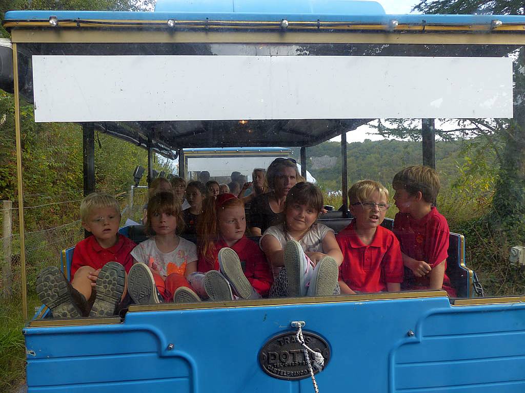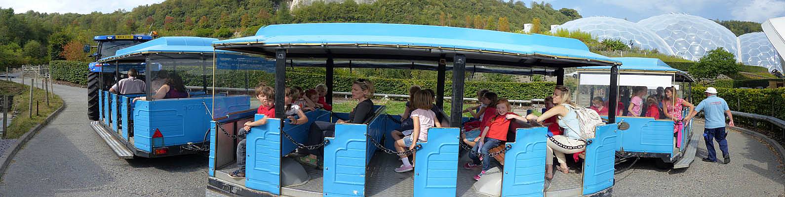 Views of the Eden Project as we ascend to the entrance. | A school class enjoying the ride up too. | Someone enjoying the Sky Ride, a zip wire over the quarry. |
