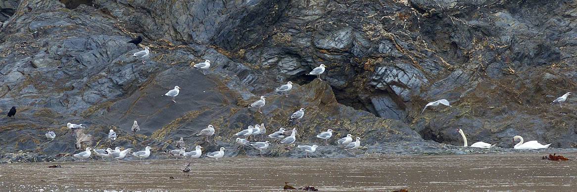 Maenporth beach. | Maenporth surf. | Gulls and swans on the rocks by the beach. |