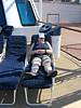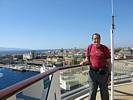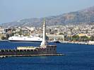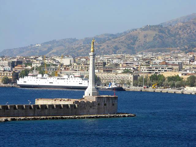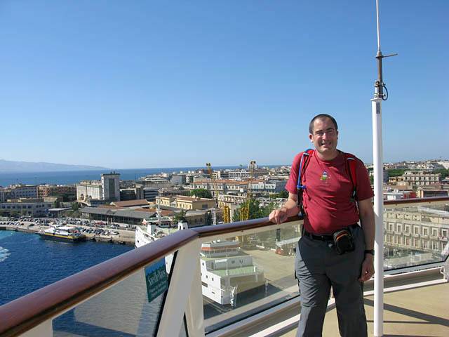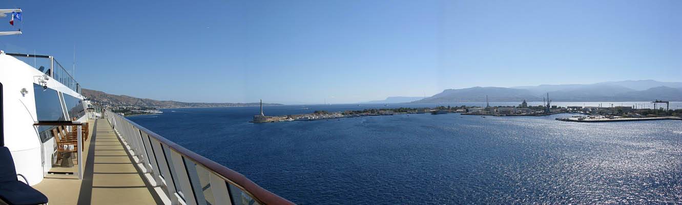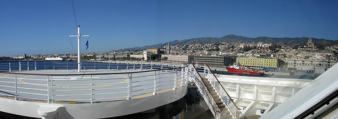 Oh yes! We are definitely in Sicily now! | Renée giving a sun lounger on Deck 15 forward a try. | Looking back to the harbour entrance and along the straight. | Me on Deck 15 forward with the port of Messina behind me. |