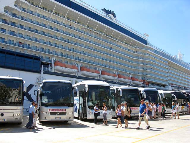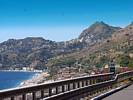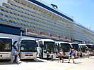 The row of numbered coaches on the shore by the ship, waiting to take people on the many different excursions. | Driving along the autostrada was fun! | The first shot of Mount Etna as it looms into view. | A view of Taormina before the autostrada dives underneath it in a tunnel. | A more majestic view of Etna from the autostrada. |