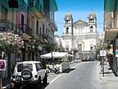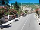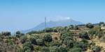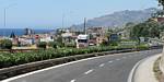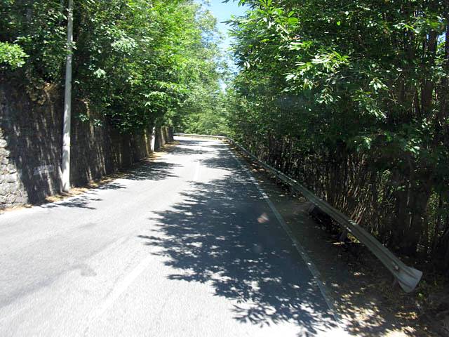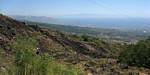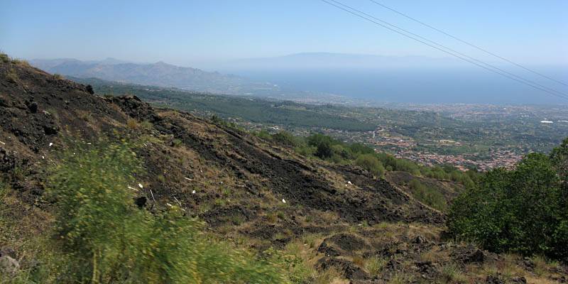 Ascending the narrow windy road through towns and villages on the lower slopes. | Vineyard. | Chestnut forest. | Looking back along the coast after we clear the tree line. The toe of Italy is clearly visible on the horizon. |