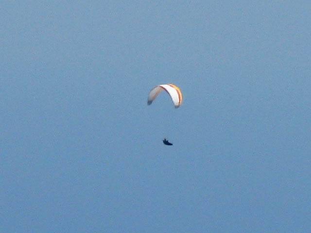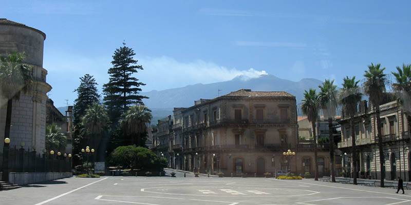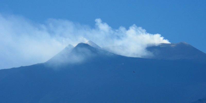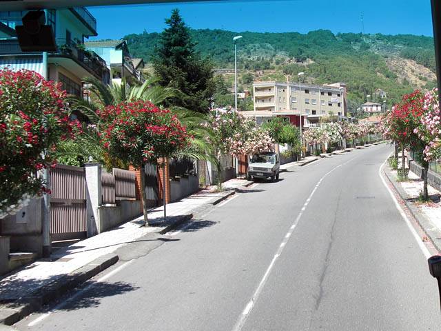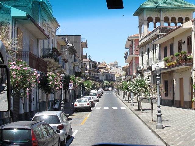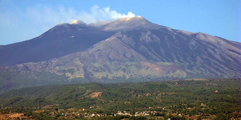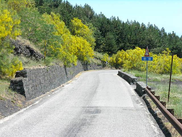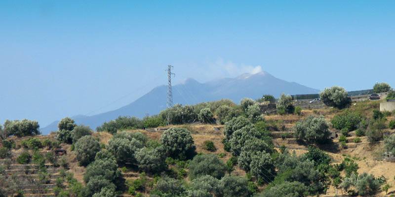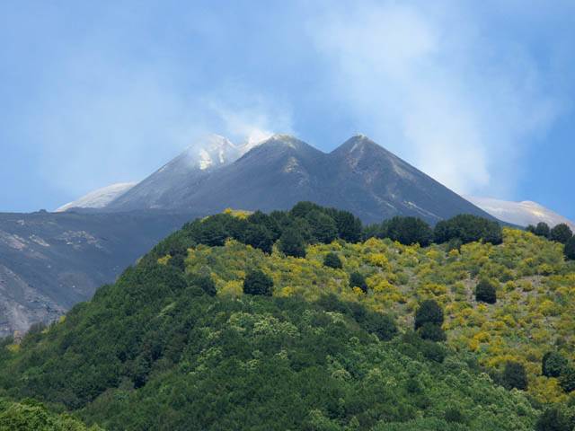 Another look at the blossoming broom above the tree line. | In the distance a paraglider was soaring. Apparently they can launch from near the top of Etna and make it all the way to the coast. | Passing through a pretty town on the way down. | Behind us the summit of Etna continued to smoke spectacularly. |