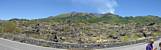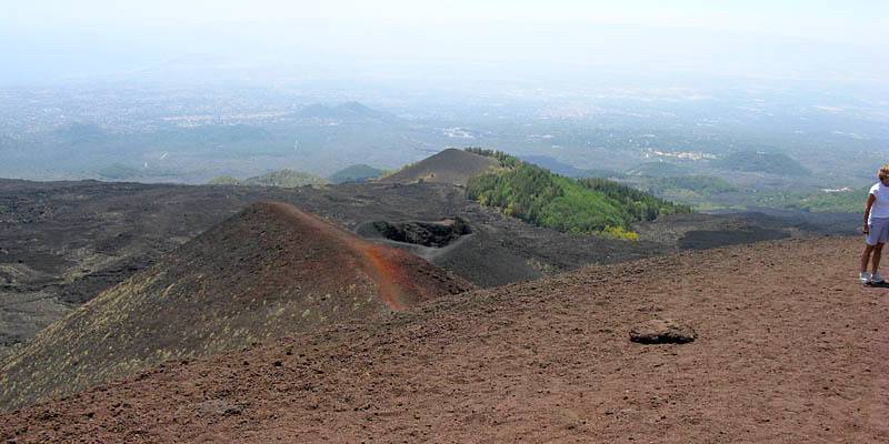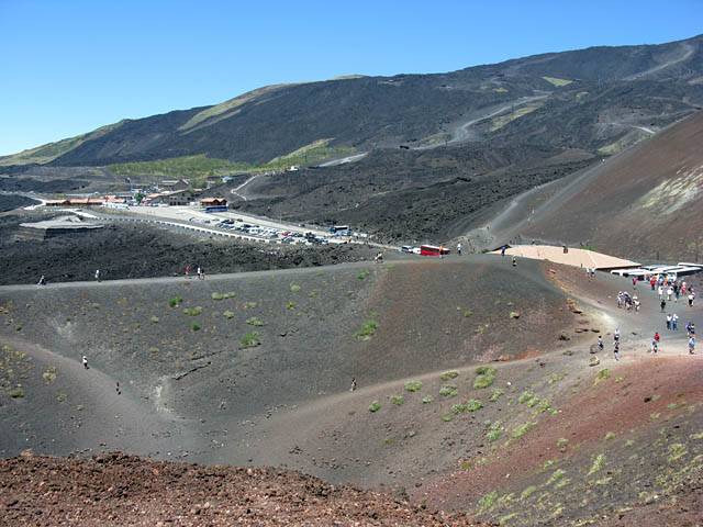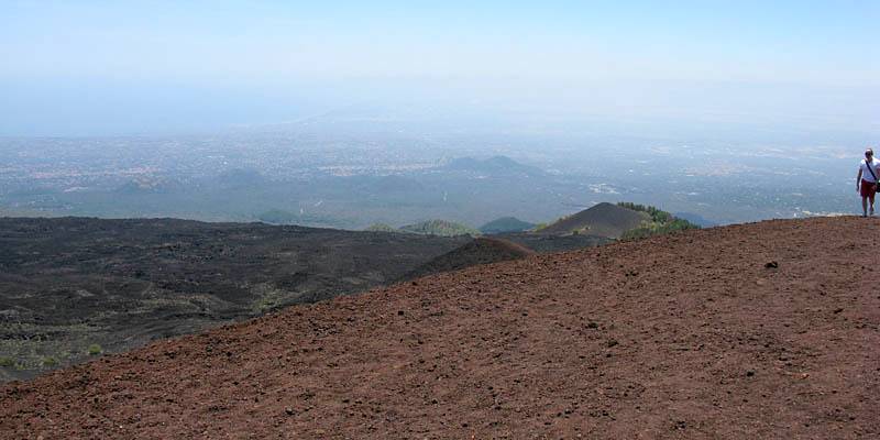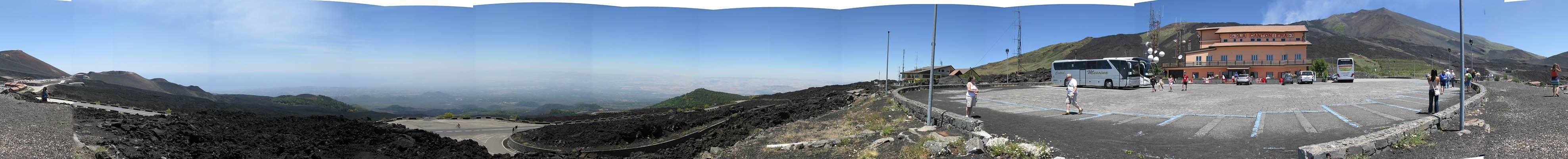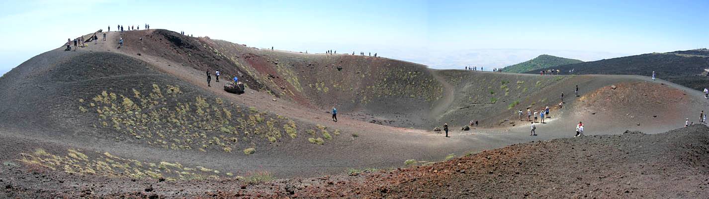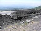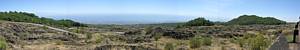 Looking down you can just make out the coastline of Sicily looking towards the Southernmost point. | Looking back towards the refreshment place. | Other spent craters below the main one. | A panorama of the main Silvestri spent crater from a small hill to the side. | A closeup of the lava rubble that I was standing on. a mixture of black and red rocks, the colour depending on how oxidised the iron content was before the lava solidified. |