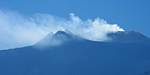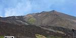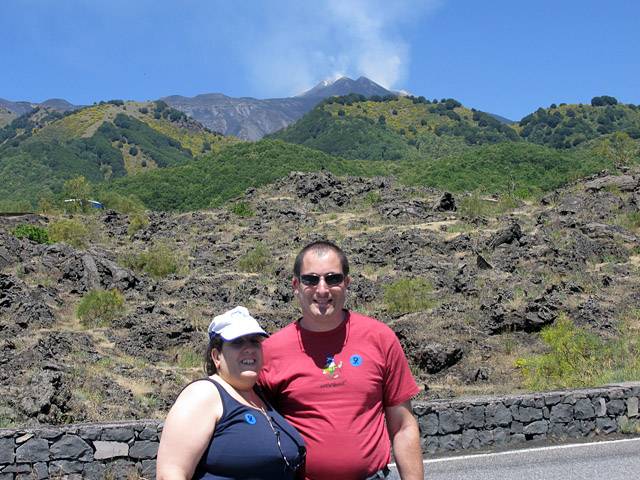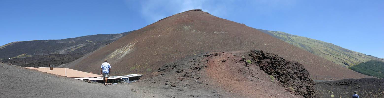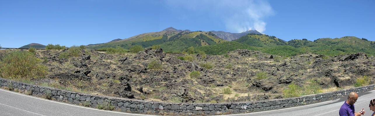 Looking up to the smoking summit. Apparently some of those peaks were created in April, just 3 months ago. The landscape and topography changes frequently around here. | Panorama looking downslope towards the sea. The winding ribbon of tarmac we just drove through the 19th century lava flow. | Renée and I below the smoke of Etna. | 3 shot panorama of the view towards the summit. |